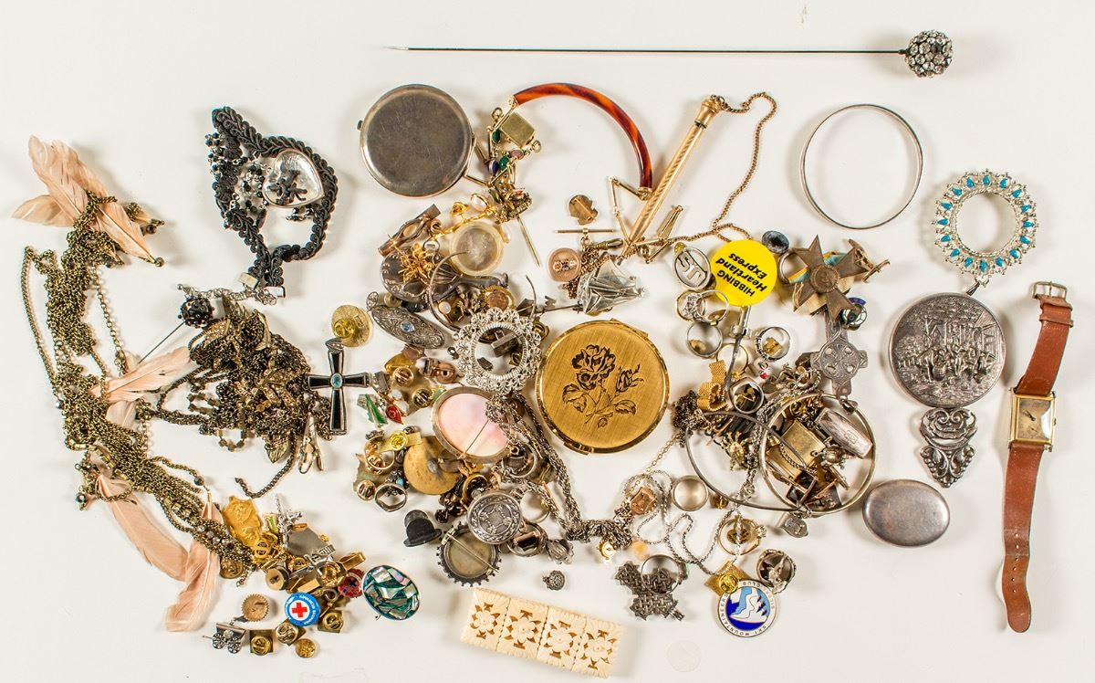 Ah, the treasures you will find here! Lot includes a feather and brass necklace, a 12" stick pin, gold and silver rings, pins, necklaces, bracelets, compacts and a wild variety of miscellany. City: State: Jewelry Date: Inventory# 38206