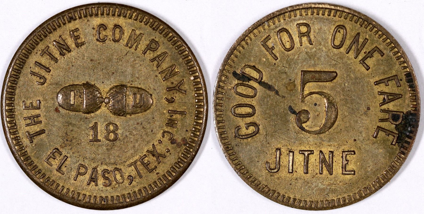 The Jitne Company/(pic attached pair of acorns)/ 18/ El Paso, Tex.//Good For One Fare/5/Jitne. rd, br, 21mm. This is the top Texas token in Coffee- Atwood, rated at $250 decades ago, one of the top values assigned to any token in the transportation token book. Unc. From the J. F. Miles Collection of Ely, Nevada of items generally collected in the 1920s.