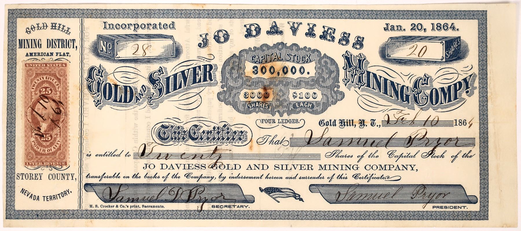 Jo Daviess Gold and Silver Mining Company Stock Certificate - American Flat, Gold Hill Mining District, Gold Hill, N.T. This is a very striking certificate: blue on white, fancy scrip and gold ingots to hold numbers. etc. Certificate # 28 for 20 shares to Samuel Pryor datelined Gold Hill, N.T. on February 10, 1864. Signed by Samuel D Pryor, Secretary and President, Samuel Pryor. Tightly held company! Incorporated Jan. 20,1864 and capitalized at $300,000; 3000 shares at $100 per. Four ledges on the mine. Not cancelled. 25-cent Power of Attorney Revenue stamp. Discoloration center and top left. No edge or corner issues. Nice! Named in honor of a true Gold Rush pioneer. Listed as ëJoe Davis' in Collins with S. D. Pryor as secretary. Samuel Pryor was listed as a miner for the Sides Mining Company.†Blue print by H.S. Crocker in Sacramento. American Flat Nevada