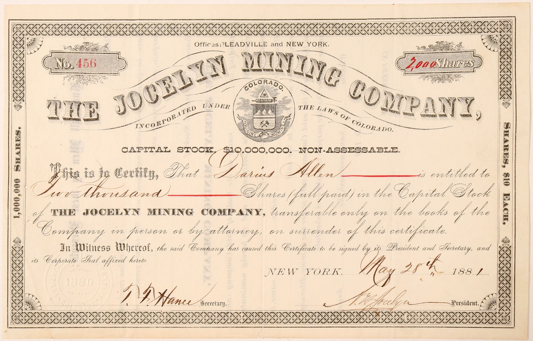 Inc. in Colorado. Offices at Leadville and New York. No. 456, issued for 2,000 shares to Darius Allen on May 28th, 1881. Signed by president Jocelyn and secretary Hance. Not cancelled. 6.5" x 10.75" Folds, pinholes, creases. Not listed in the 1883 Colorado Mining Directory. () State: Colorado City: Leadville Date: 1881