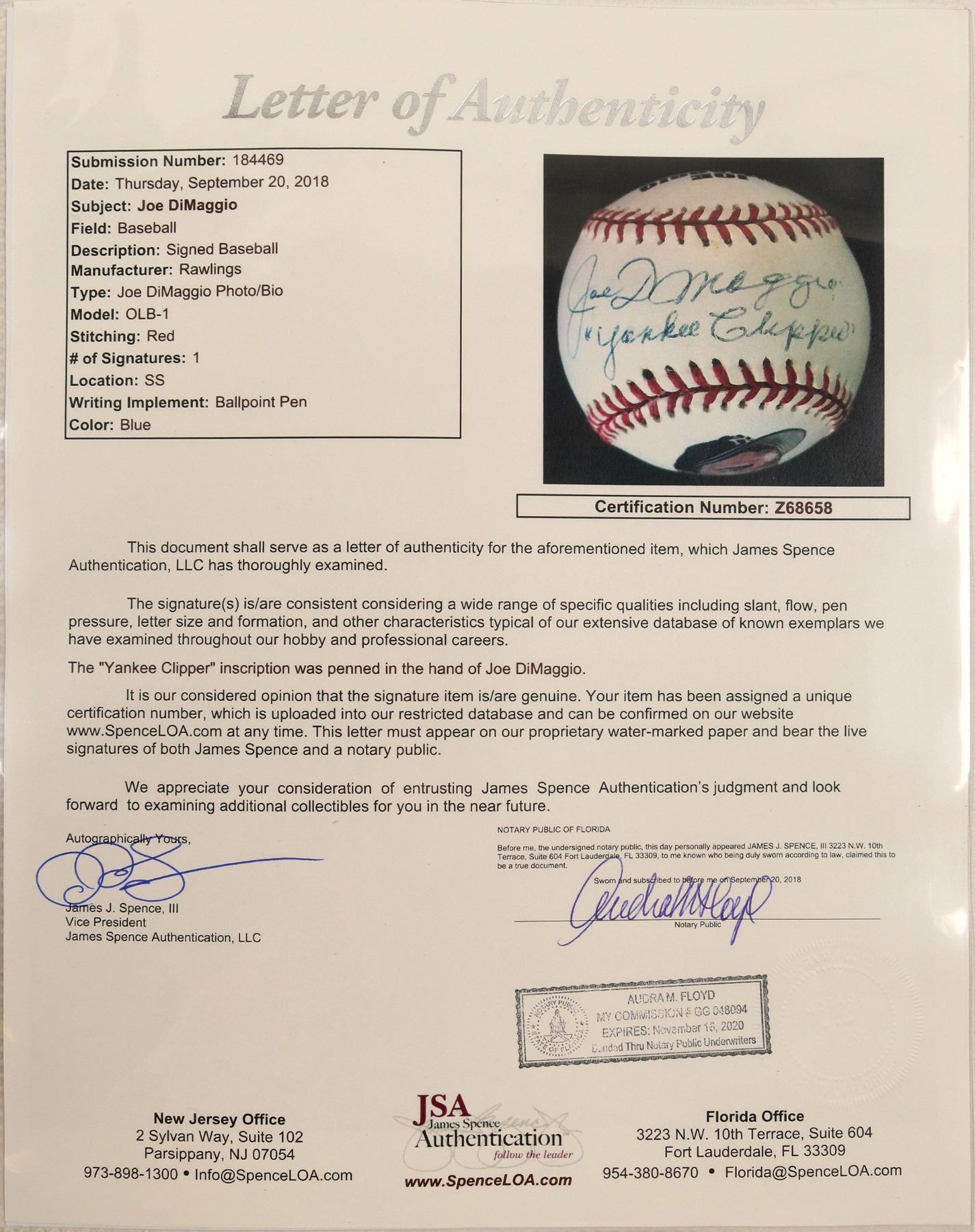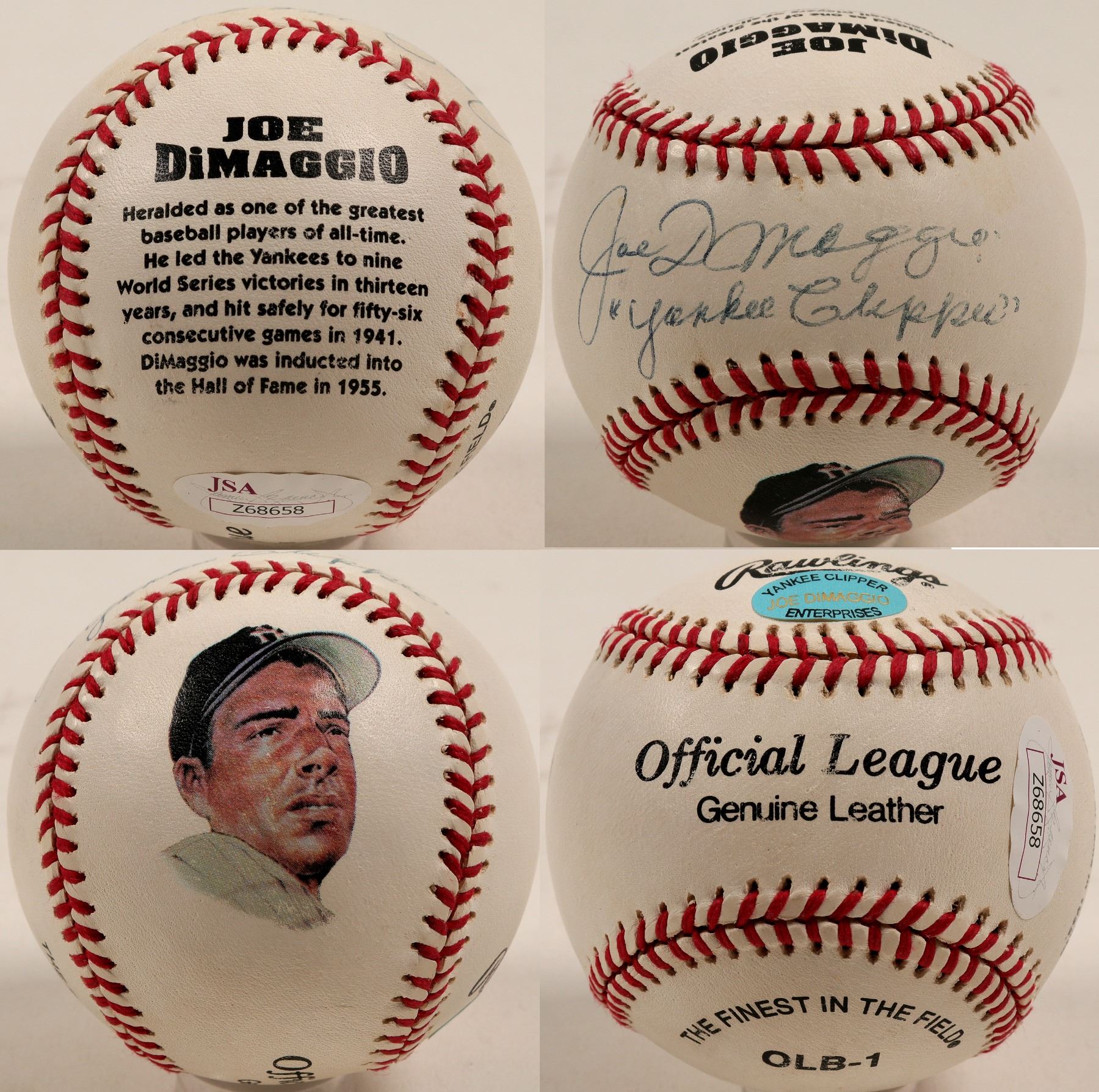 This baseball is signed by Joe DiMaggio "Yankee Clipper" JSA # Z68658 with a photo likeness of Joe. No display box just the original Rawlings box with letter of authenticity. This ball player needs no introduction; (arguably) the best baseball player in the history of the game. "Joltin' Joe" made MVP status three times in his career; 1939, 1941, and again in 1947. He retired from baseball in 1951 and entered the Baseball Hall of Fame in 1955. Take home a piece of baseball history that no-one can deny.
