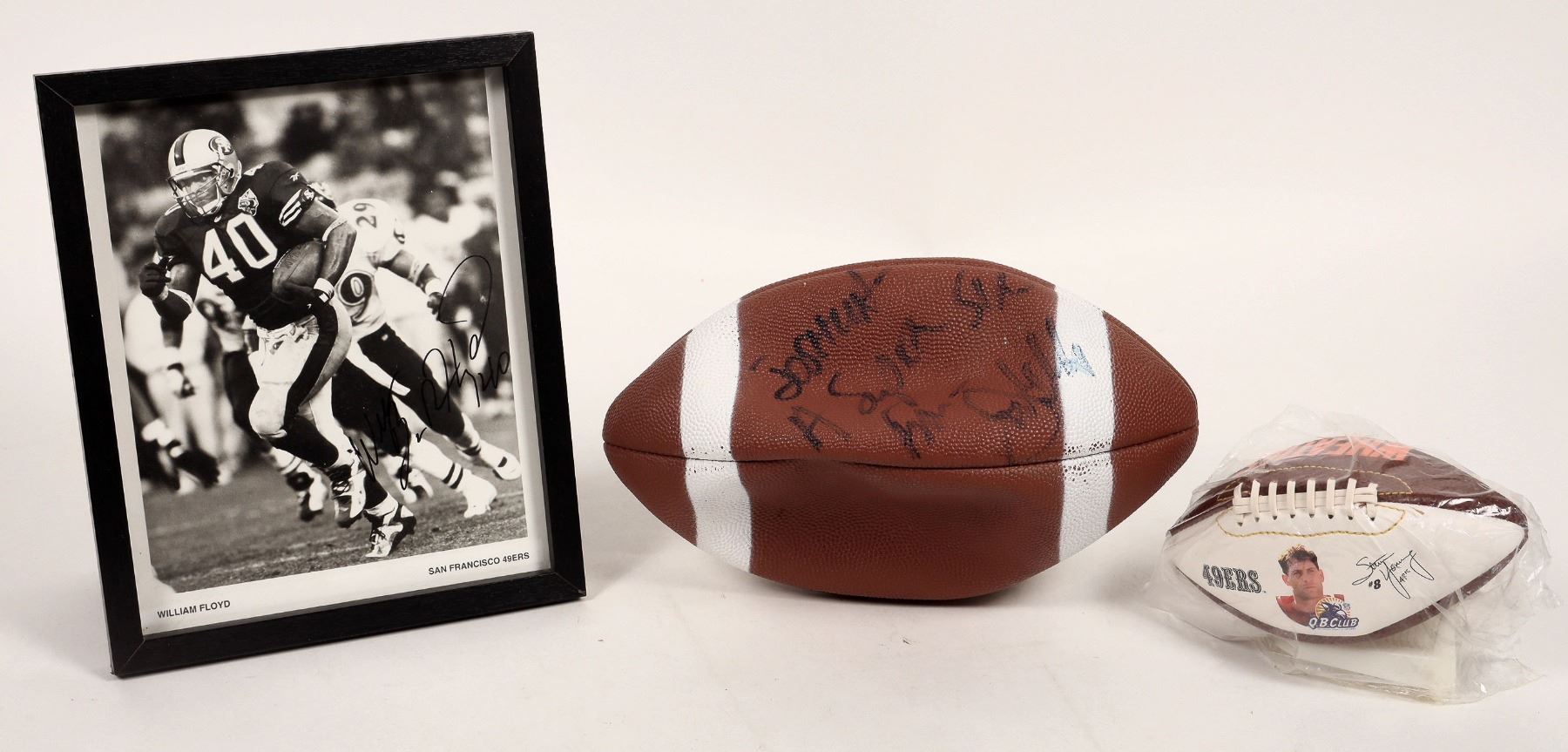 Joe Gibbs autographed NFL game football, "Joshua, A super Skins Fan/Joe Gibbs". Inducted into the Hall of Fame in 1996, yet no HOF 96 inscription as seen in late days, so likely older. Signature is light. Also, SF 49er William Floyd autographed 8x10" b/w photo and small Wheaties Steve Young non autographed ball.