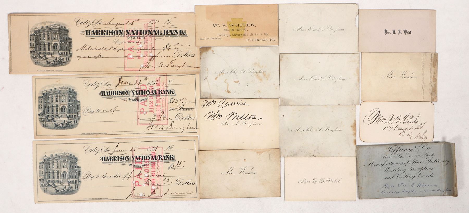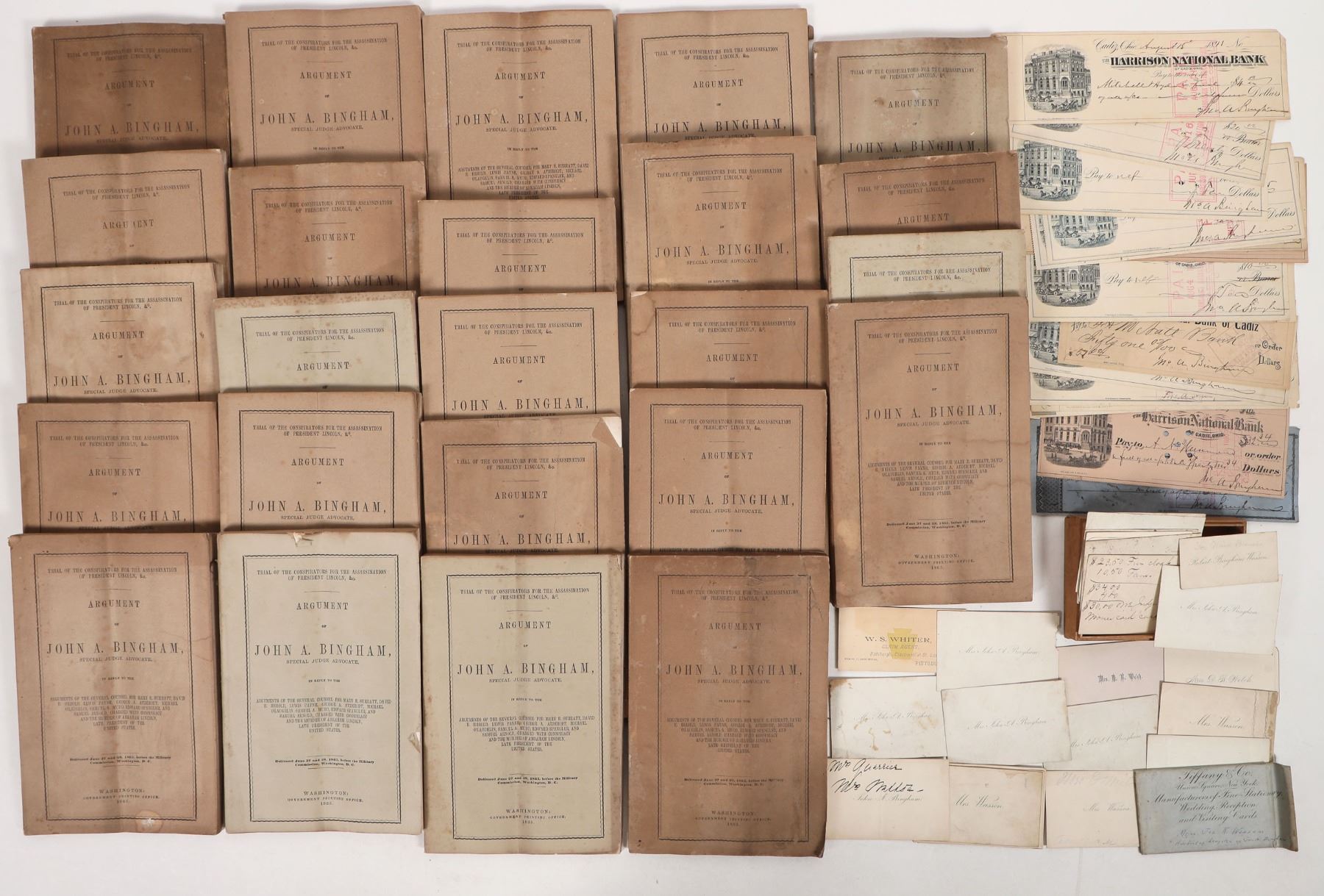 25x 1865, Trial of the Conspirators for the Assassination of President Lincoln. Condition varies with some stained etc. Also original John Bingham copper plate for his business card with some cards. About 15 checks c. 1890's signed by Bingham. From the estate of John Bingham, an attorney from Cadiz, who gained world-wide fame as the prosecutor in the Lincoln assassination conspiracy, a successful prosecution that resulted in the hangings of Mary Surratt, Lewis Powell, David Harold and George Atzerodt.