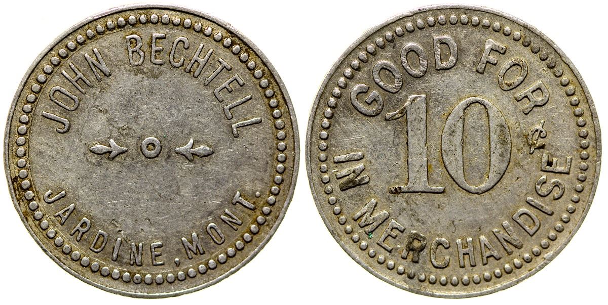 R-9. John Bechtell / Jardine, Mont. // GF / 10c / In Merchandise. Round, aluminum, 25mm. (Svoboda Collection) City: Jardine State: Montana Date: HWAC# 35057