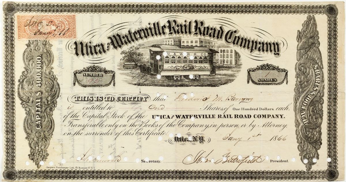 Utica and Waterville Railroad Company stock certificate with revenue stamp, signed by President John Butterfield. Vignette of an early rail car. 11 x 6". The rail line opened November 14, 1867. John Butterfield was an operator of stagecoach and freight lines in the 19th century in the American Northeast and Southwest. He founded companies that became American Express and Wells Fargo. Butterfield also founded the Butterfield Overland Express and from 1858 to 1861 operated a stage route running from St. Louis to San Francisco, connecting California to the growing nation. (Prag Collection)