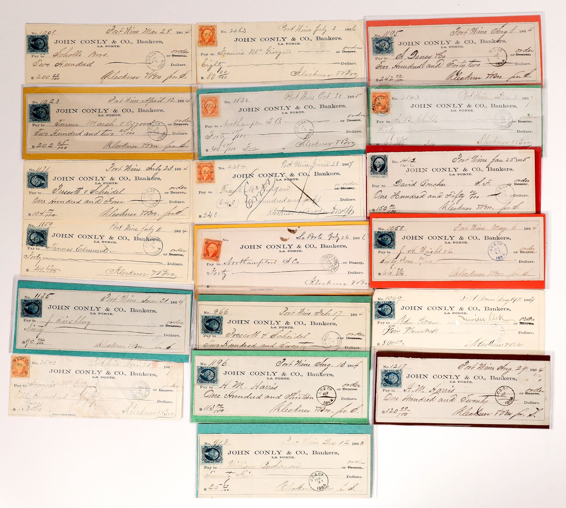 19 c. 1864-66 John Conly & Co. checks on Kleckner & Bro. account out of Port Wine. He was doing business with merchants and miners who were not local or in San Francisco. At least one, Scholle Bros., is a NY dealer. The other recipients could be unrecorded miners? La Porte California
