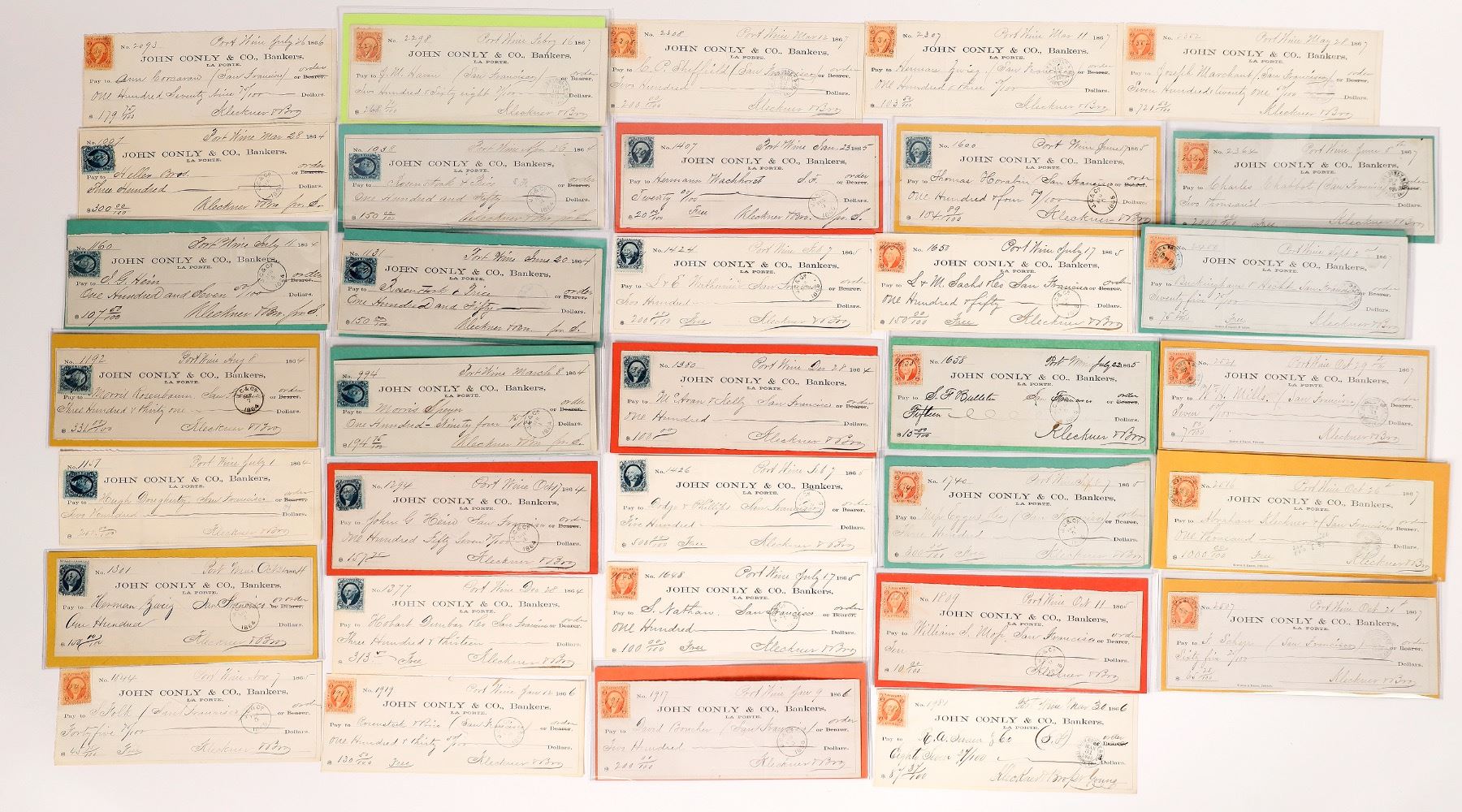 32 c. 1864-67 John Conly & Co. checks to San Francisco merchants, from Kleckner & Bro. account in Port Wine, a town 2 miles SSE of La Porte. Kleckner bought gold from mines, see page 283. La Porte California