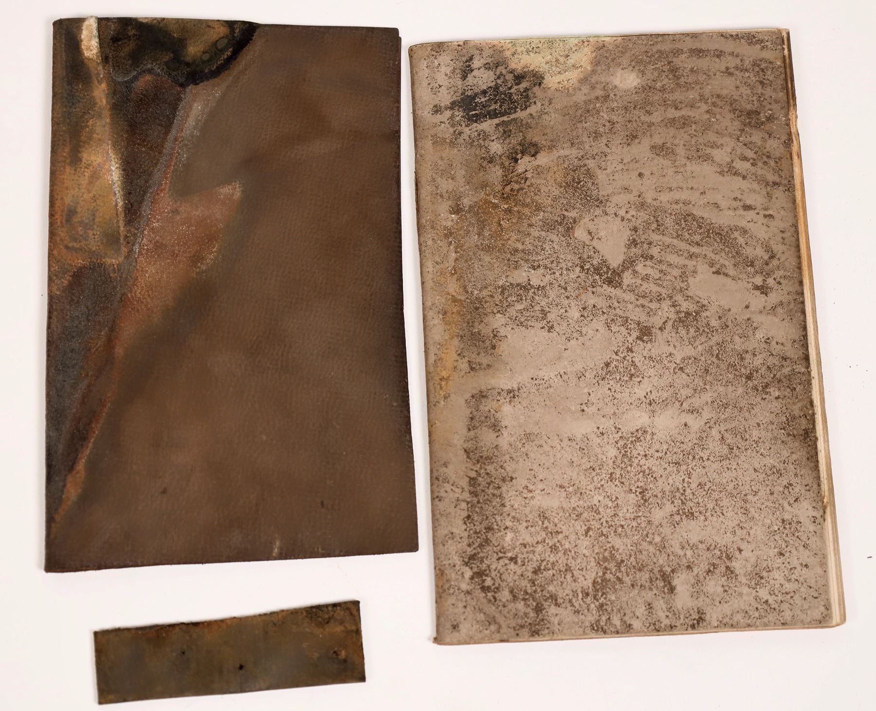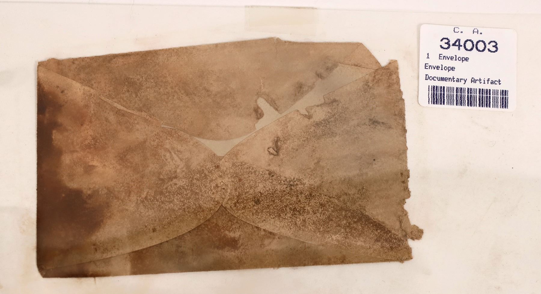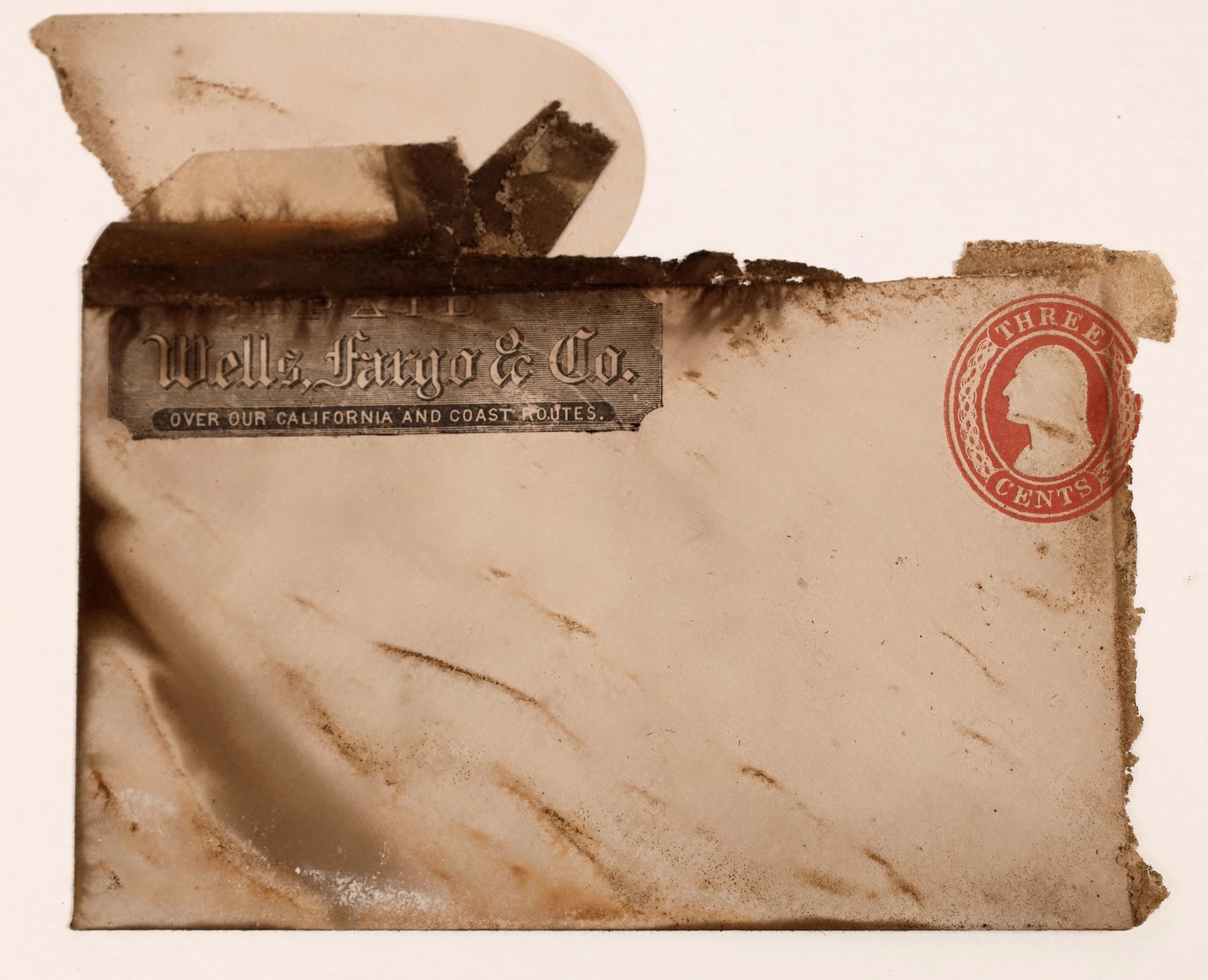 Small collection of personal papers from the John Dement trunk, conserved by the Northeast Document Conservation Service in Andover. This collection includes a number of paper scraps, some matching in size (2 x 2" square) with no discernable printing. One cover is addressed to a person in Washington (no contents). A leather covered bankbook-style pocket booklet (ledger) is present with only one pencil notation: "385 B Way" (no information found on this); an unused Wells Fargo franked envelope with imprinted US postage. The latter item is especially important in the context of the usage of Wells Fargo in the mails during the California Gold Rush, here by a man who traveled the California and Oregon gold regions and was part owner of a store in Oregon City. This is the best by far of the two Wells Fargo covers recovered and conserved from the SS Central America, the other being only a partial cover.