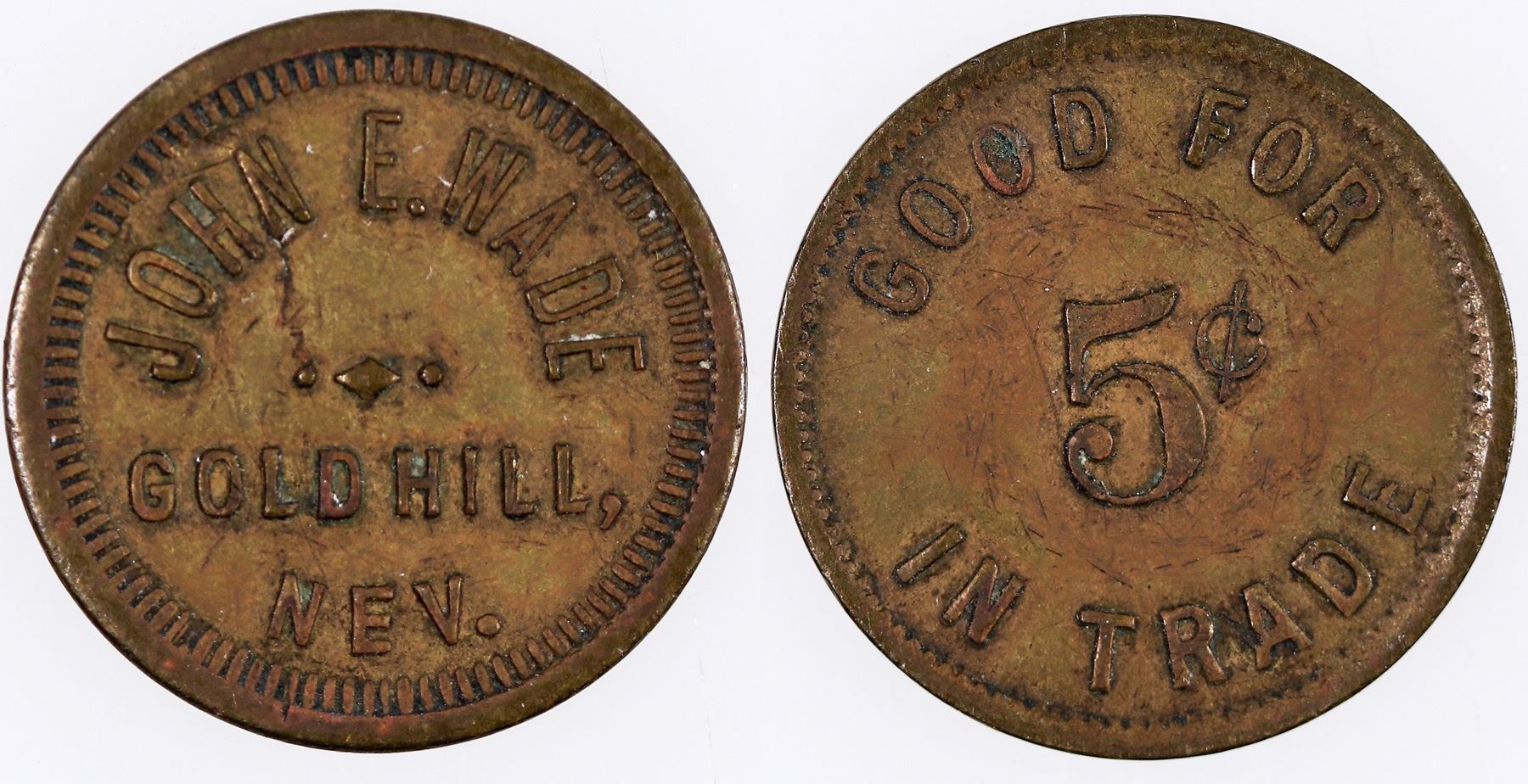 JOHN E. WADE / GOLD HILL, / NEV. // GOOD FOR / 5¢ / IN TRADE; Br., rd., 21 mm.