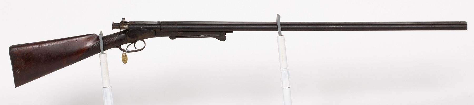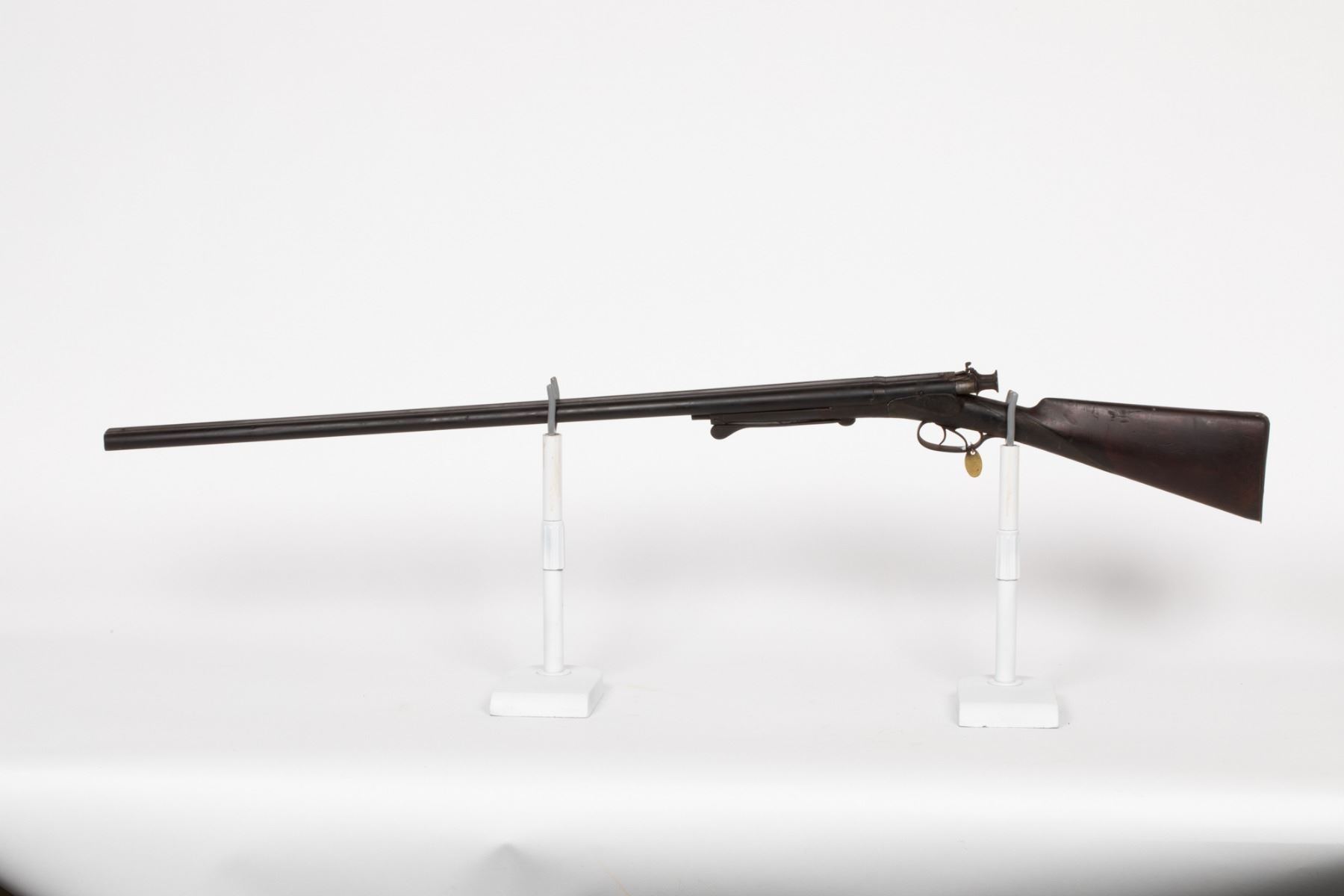 Double-Barrel, John F Dittrich, New Orleans, 16-gauge, SxS, pull back hammer, release ever bottom of fore stock, beaded front sight, metal butt plate. SN: 594, JMD Oval Tag: 9206, Condition: Good, >