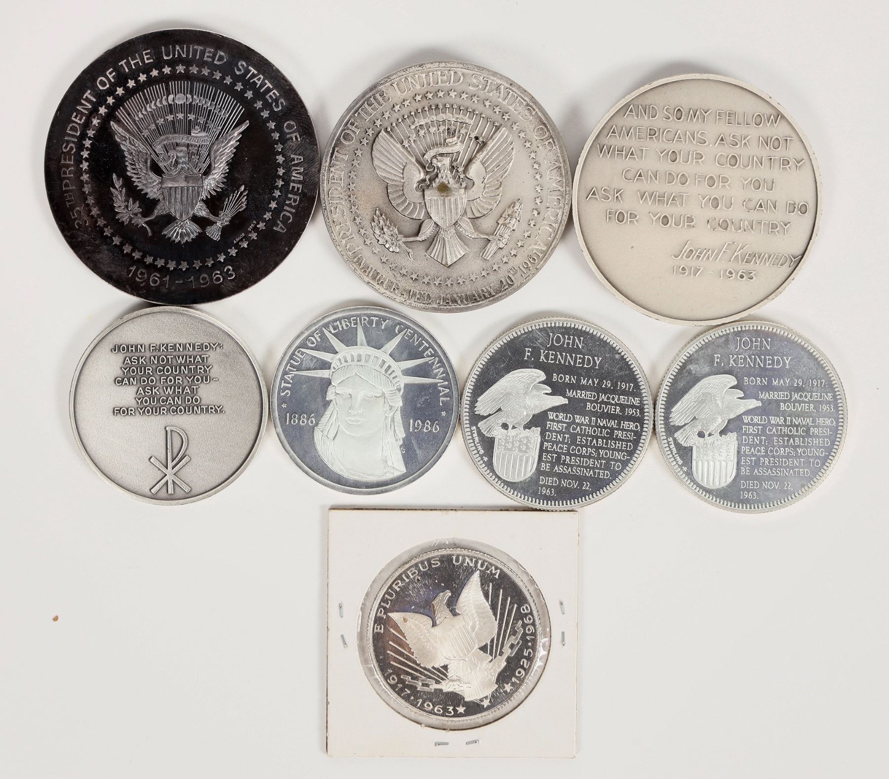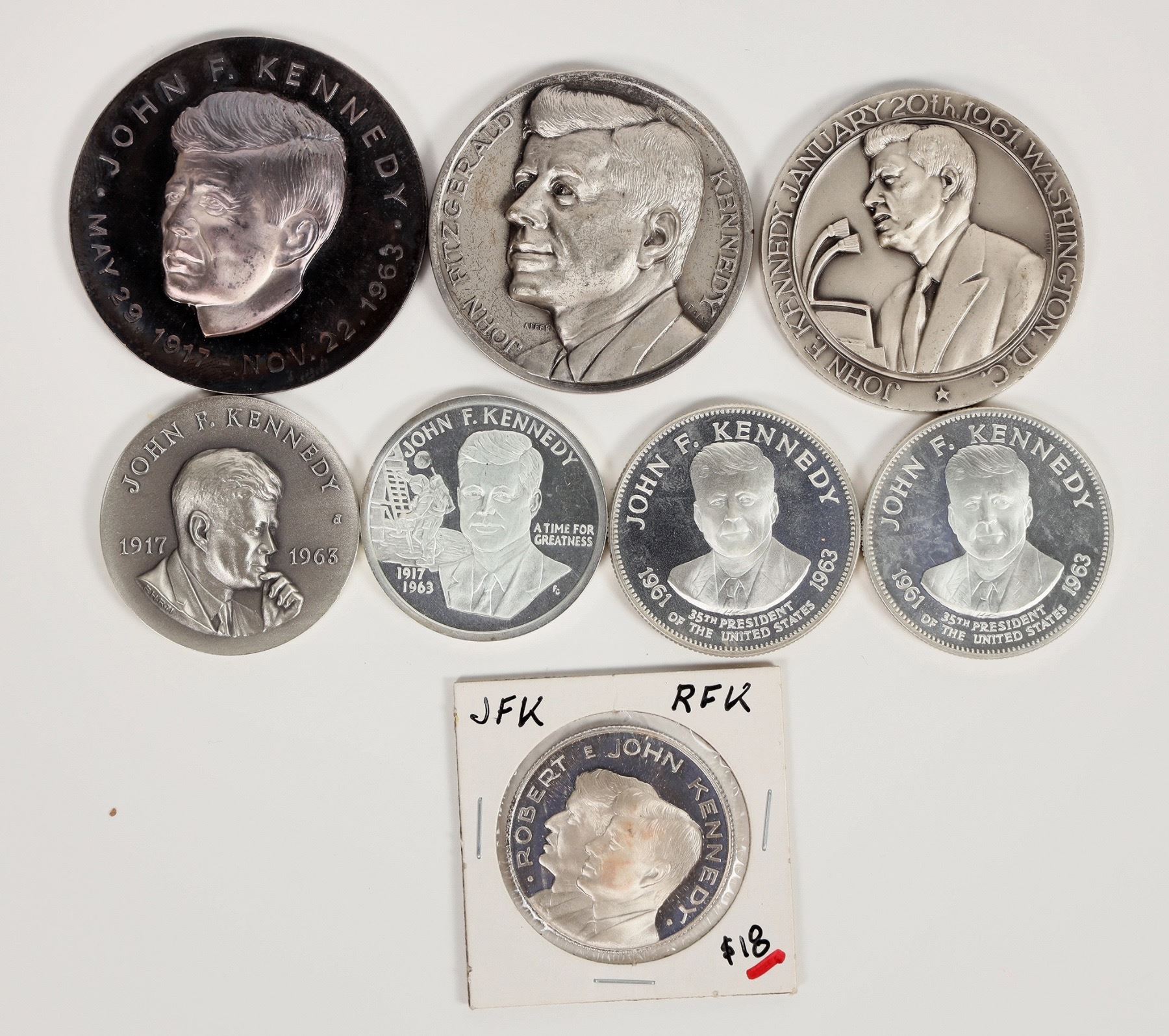 Eight silver medals commemorating John F. Kennedy. Only one is marked sterling, but most appear to be silver.