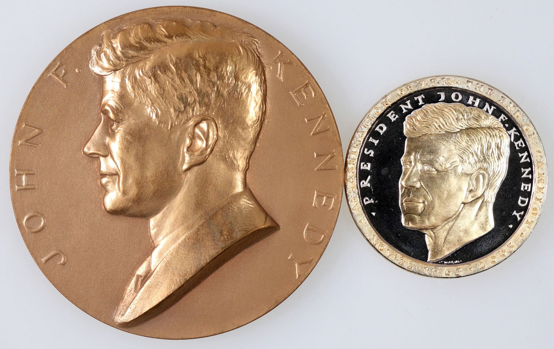 Two tributes to JFK: 1) Bronze inauguration medal, January 20, 1961; 76 mm, BU in original plastic. 2) 2003 Ghana 200 Sika 2 troy ounce .999 silver, with bronze trim engraved: "Assassination of JFK The End of Camelot / Nov. 22 1963 / 2003". 47 mm, BU.