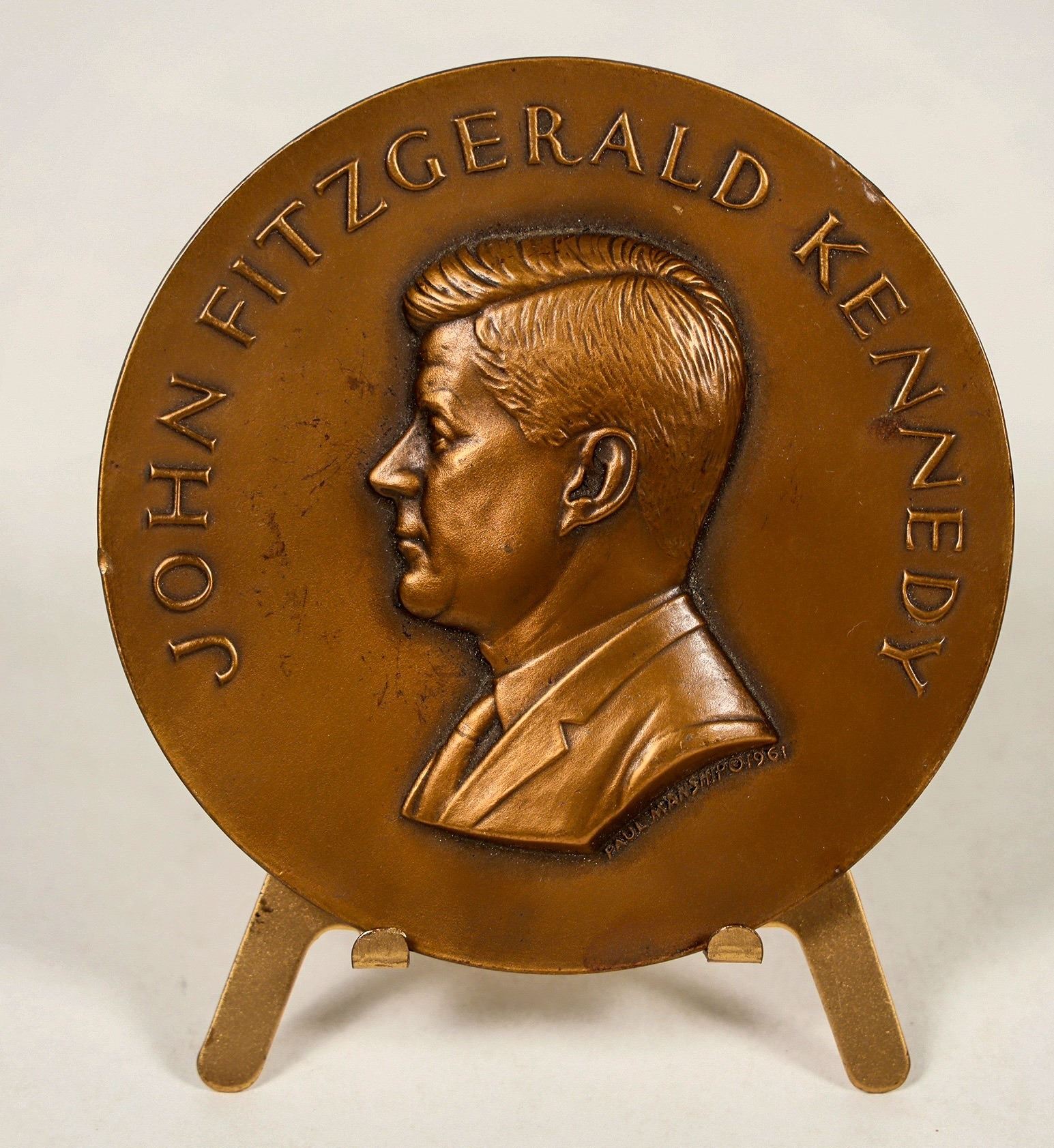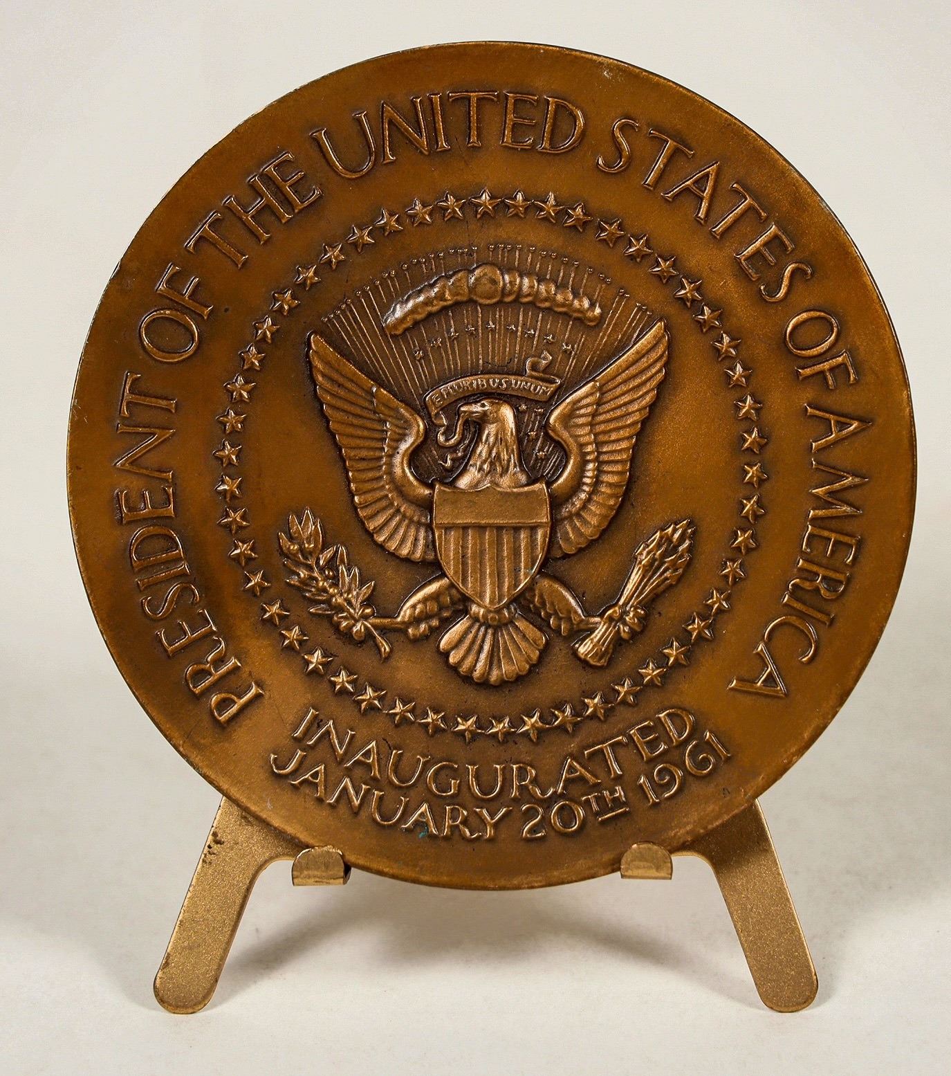 There is one bronze Inauguration Medal for JFK with stand produced by the Medallic Art Co. designed by Paul Manship (2.75 in. diameter). In very good condition. Four JFK funeral prayer cards without a border, and five JFK funeral prayer cards with a black border. A "Special Delivery From Heaven" prayer written by Barbara Jones with even copies. Please see photo for details.
