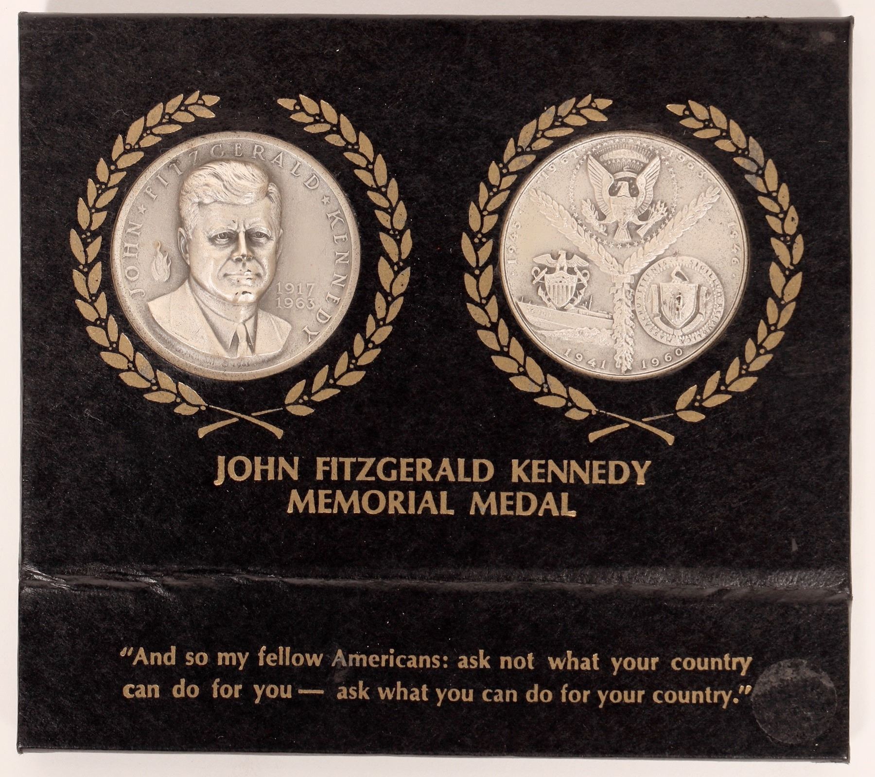 Presidential Art Medals issued these two silver medals sculpted by Ralph J. Menconi in 1964, shortly after JFK's assassination. In original box with paperwork. 37 mm. 999 silver. Salvatore Falcone Collection
