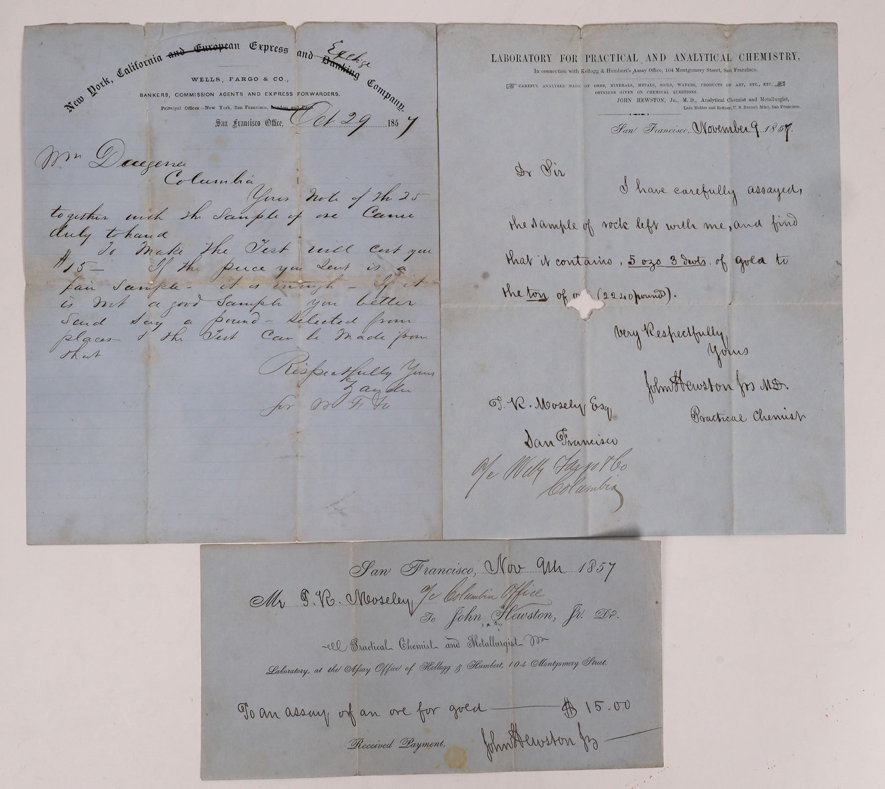 In 3 pieces. Correspondence on letterhead of John Hewston, Analytical chemist and Metn interesting set in that it the first document is datelined Columbia, October 29,1857 from a Mr. Zander a Wells Fargo agent to a miner, "Your note of the 25th together with the sample of ore came duly to hand. To make the test will cost you $15. If the piece you sent is a fair sample, it is enough. If it is not a good sample, you better send say a pound selected from places and the test can be made from that. The letterhead of the Wells Fargo & Co. reflects "New York, California and European Express and Banking Company of Wells Fargo & Co., however the words "and European" and "Banking" are crossed out and the word "Exchange" is substituted for Banking. Similarly, the words "London and Paris" are crossed out just below. The next document on the letterhead entitled "Laboratory for Practical and Analytical Chemistry" and subtitled "In conjunction with Kellogg & Humbert's Assay Office, 104 Montgomery Street, San Francisco" is datelined November 9, 1857, and signed by John Hewston. The letter is addressed to J. R. Mosely Esq. of San Francisco c/o Wells Fargo & Co., Columbia. The subtitling, which is extensive and identifies a range of analyses, also identifies John Hewston, Jr. M.D. Analytical Chemist and Metallurgist, Late Melter and Refiner, U.S. Branch Mint, San Francisco. "Dear Sir: I have carefully assayed the sample of rock left with me and find that it contains 5 oz. and 3 dwts (pennyweight) of Gold to the ton of ore (small hole in paper) (2240 pounds)." Note that the Gold weights are in Troy weights where 12 Troy oz.. = pound and 20 dwt = one Troy ounce. In the avoirdupois system 1 ton = 2240 pounds avoirdupois. The assay indicates that the ore is running about $103 per ton @ $20 per oz. Gold. The third document is a receipt signed by John Hewston for the assay at $15 to Mr. J. R. Mosely c/o Columbia Office and again reflecting on the preprinted form the Assay Office of Kellogg and Humbert and John Hewston as the Practical Chemist and Metallurgist. All forms are on a light blue paper. References: John Hewston is listed in the 1856 San Francisco City Directory by Harris, Bogardus and Labatt as above on p. 62. J. R. Mosly (spelling variance) is also listed on p.83 as being affiliated with Wells Fargo & Co. Some age toning and a few minor tears not effecting content, otherwise Fine. California c1857