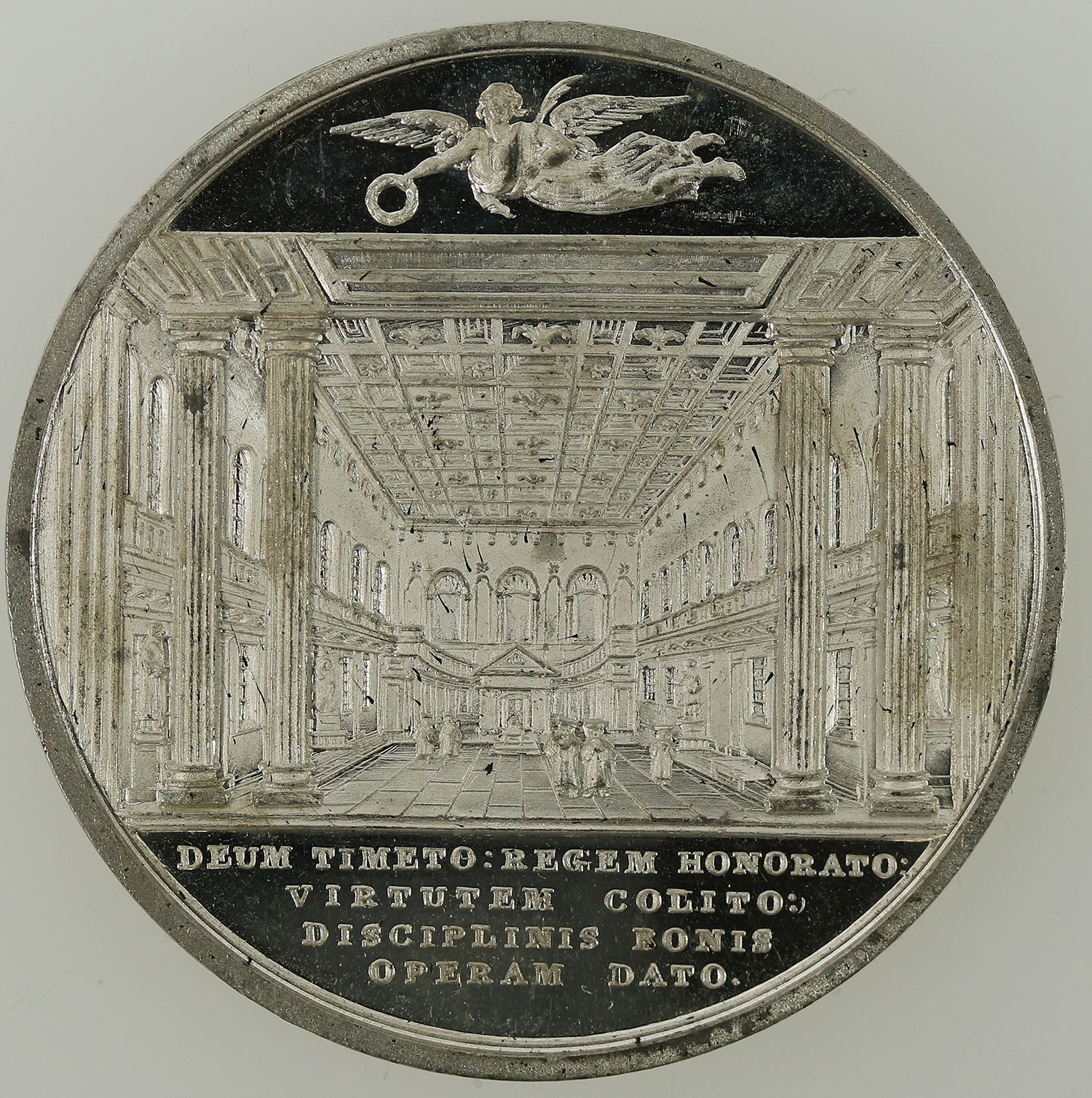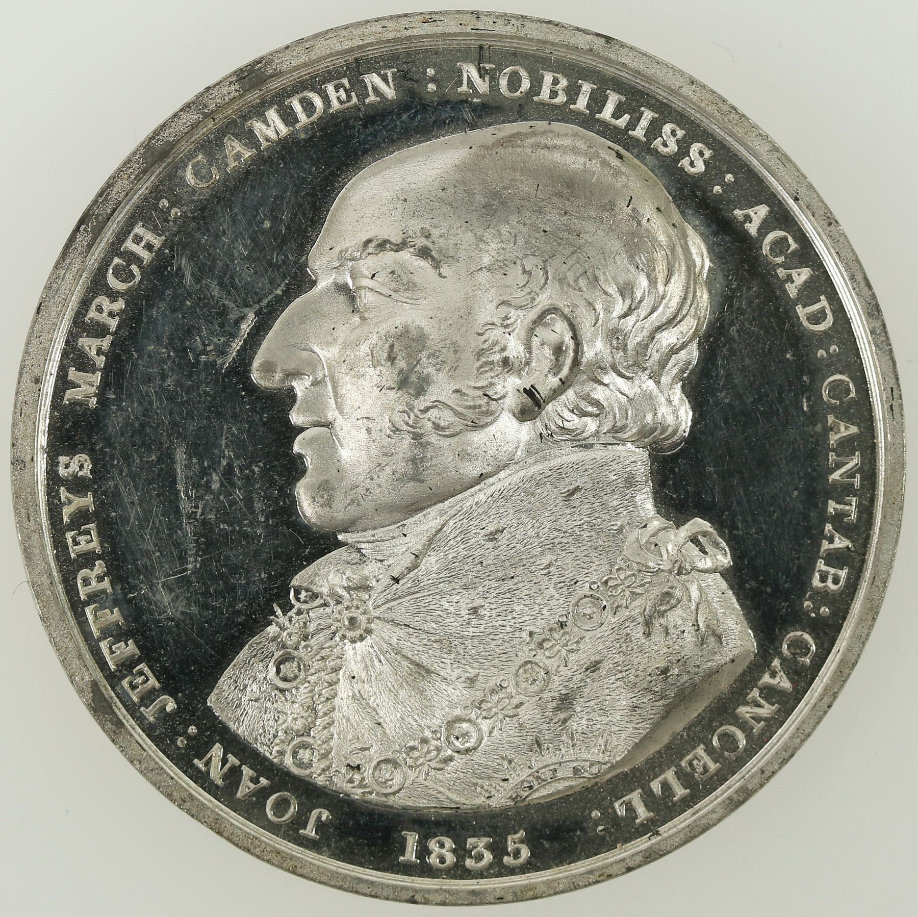White metal, proof, in original case. Obv.: Joan : Jeffries : March : Camden : Nobiliss : Acad : Cantab : Cancell : 1835 / (portrait facing left); Rev.: Deum Timeto : Regem Honorato / Virtutem Colito : / Disciplinis Bonis / Operam Dato. The Latin translates to: "Fear God: Honor the King: Cultivate Virtue: Apply Yourself to Good Studies". It is a motto, particularly associated with the University of Cambridge. 44 mm; case is 3 x 3 inches. Inscription translation: John Jeffreys, Marquis of Camden, Chancellor of the most noble University of Cambridge 1835.