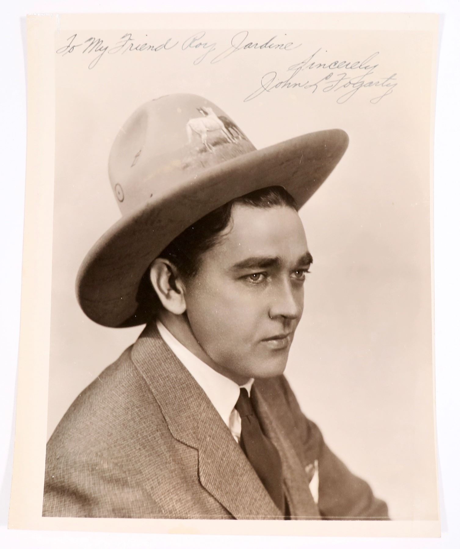 Autographed photo, "To My Friend Roy Jardine, Sincerely John L Fogarty". c. 1932-35. Fogarty was a Montana singer and his hat has a painting of two horses by O C Seltzer. The brim, directly beneath the horses, has a painting of the state seal and the crown is covered with painted depictions of Montana livestock brands. 9.75x8". Montana