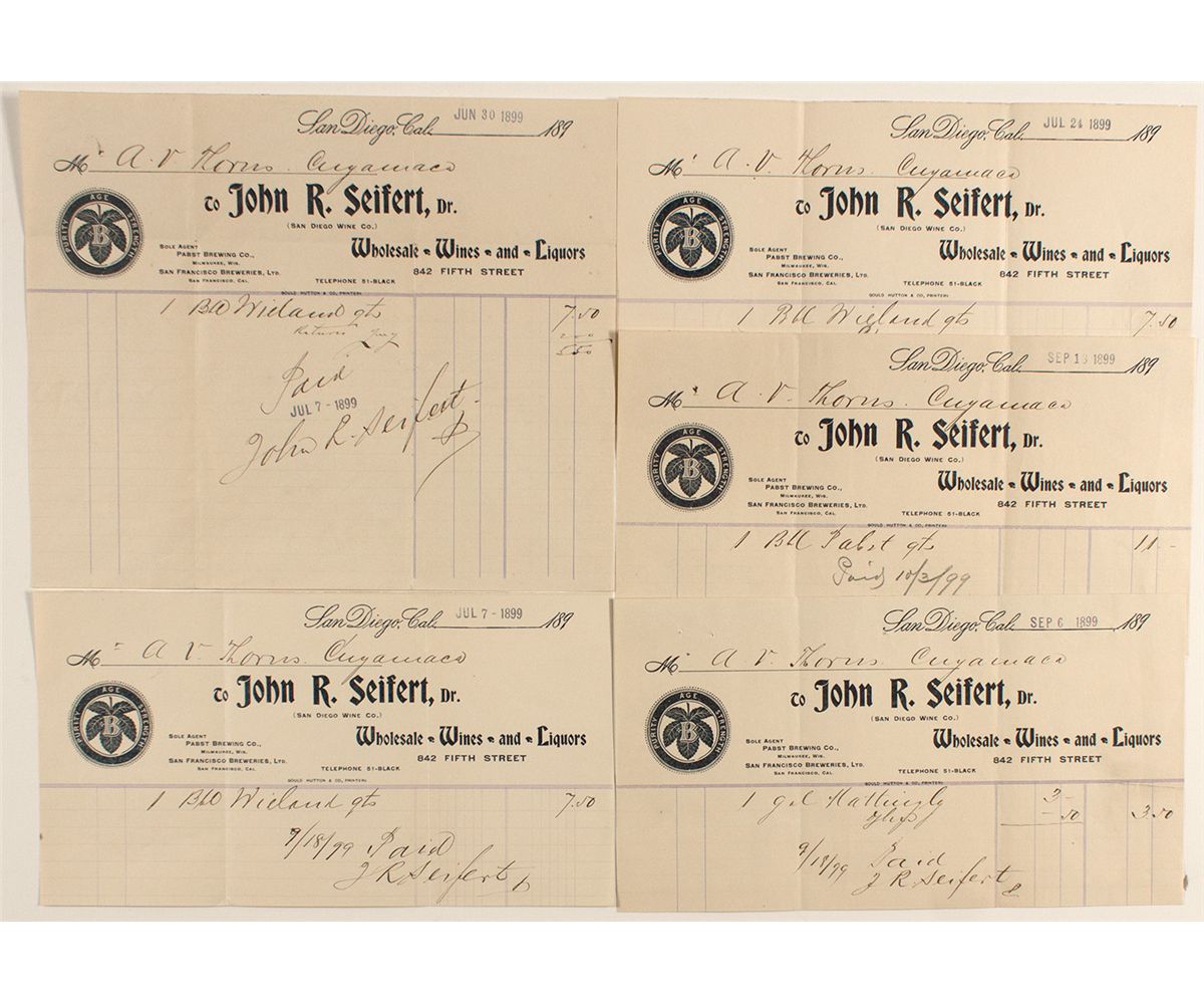 Lot of five billheads. Sole agents for Pabst Brewing and San Francisco breweries. 1899.City: San DiegoCounty: San DiegoState: CADate:
