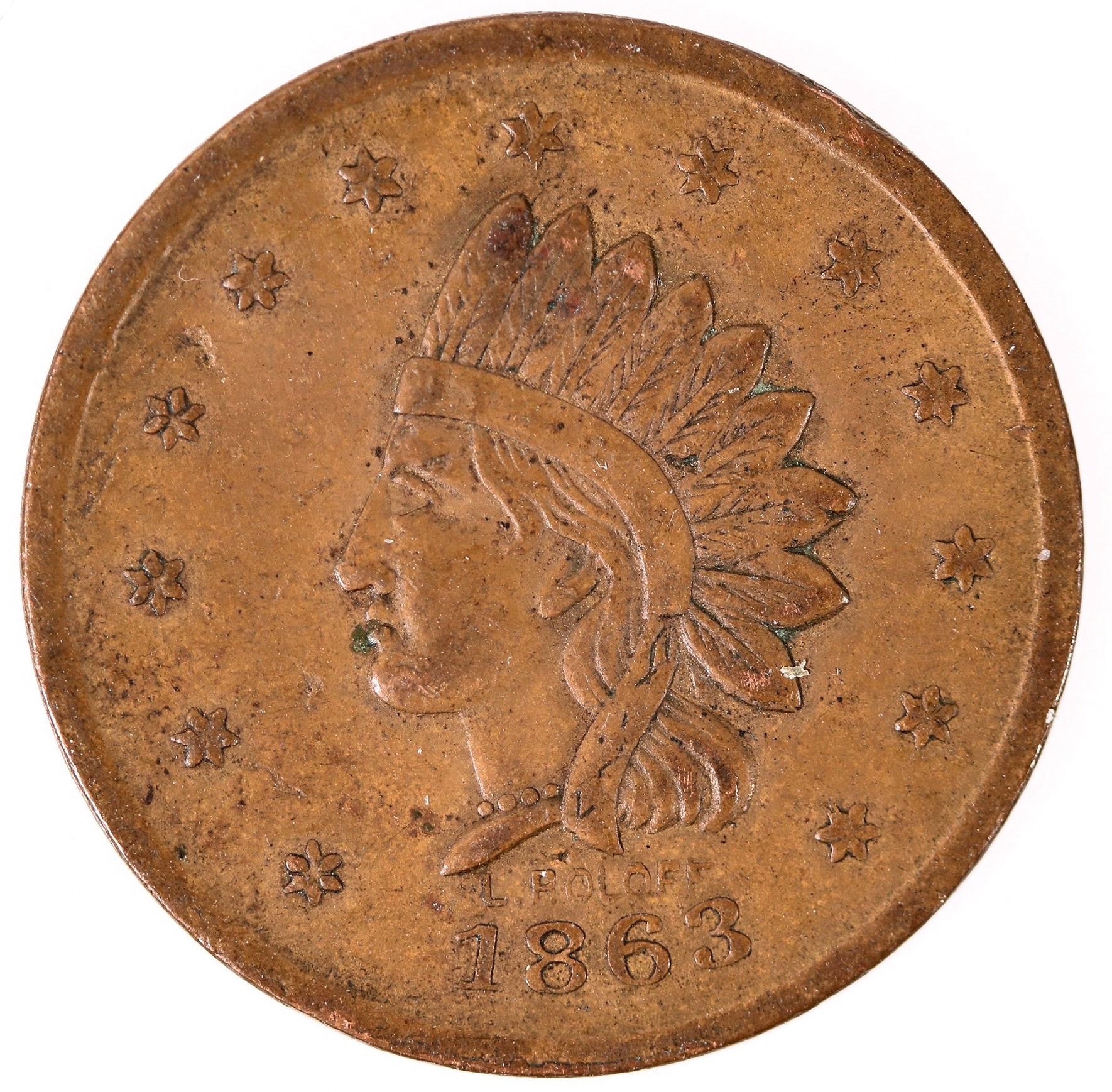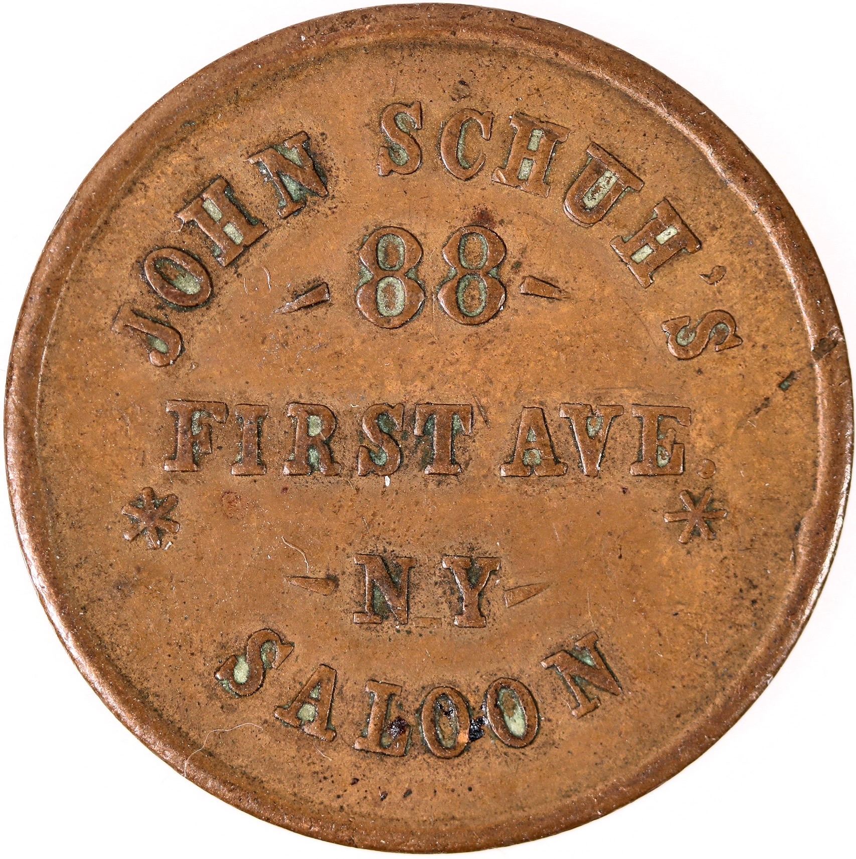 JOHN SCHUH'S / 88 / FIRST AVE. / N Y / SALOON // (Indian head) / L. ROLOFF / 1863; C., rd., 24 mm.