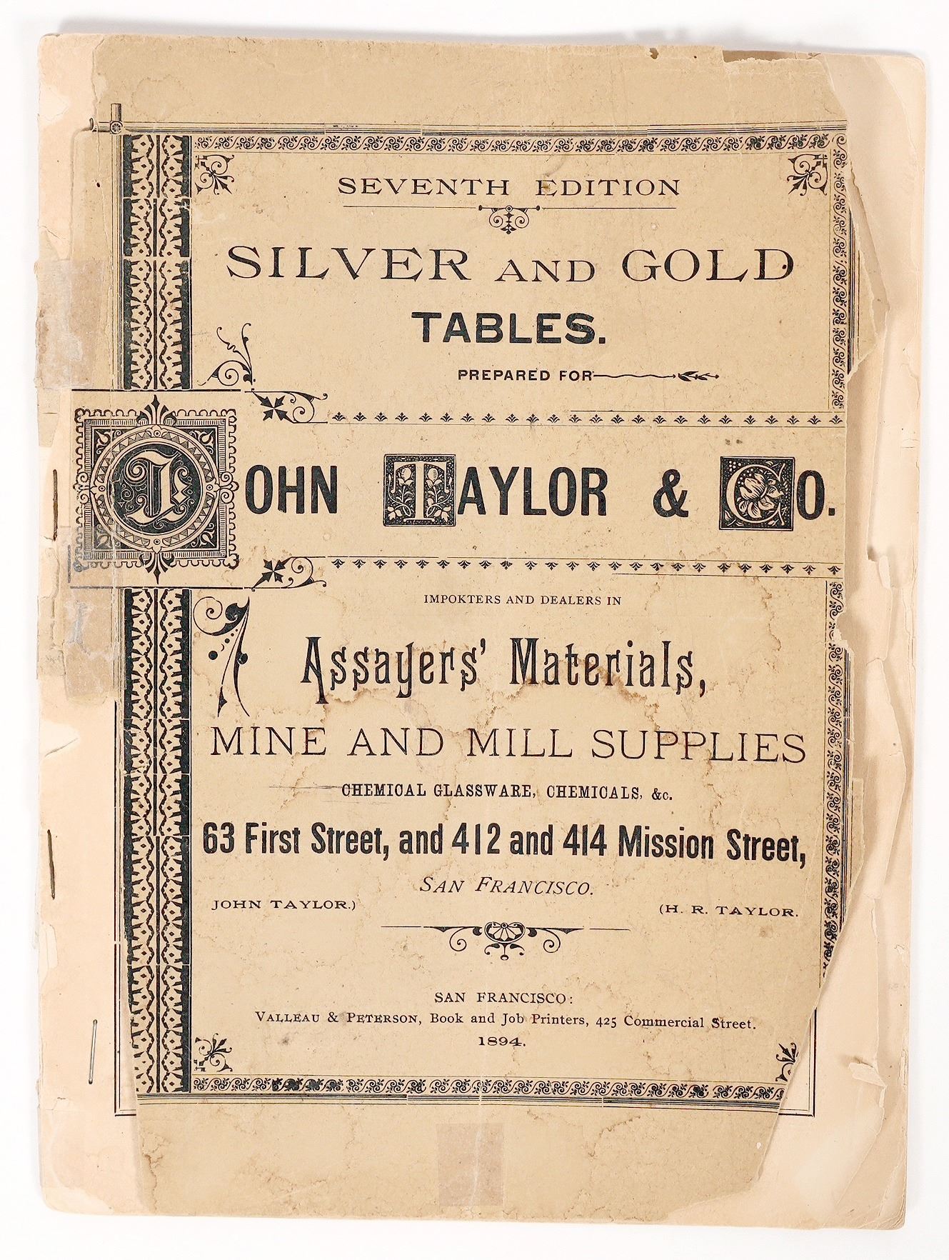 This pp.45 booklet offered by the John Taylor & Co. includes the tables for silver assay values. It is listed at their new (1894) Mission St. address in San Francisco. The cover has a lost edge but the tables are perfectly readable. John Taylor & Co. was a well respected company to the California Gold Rush era. A rare find. 7 in. 9.5 in. Please see photo for details.