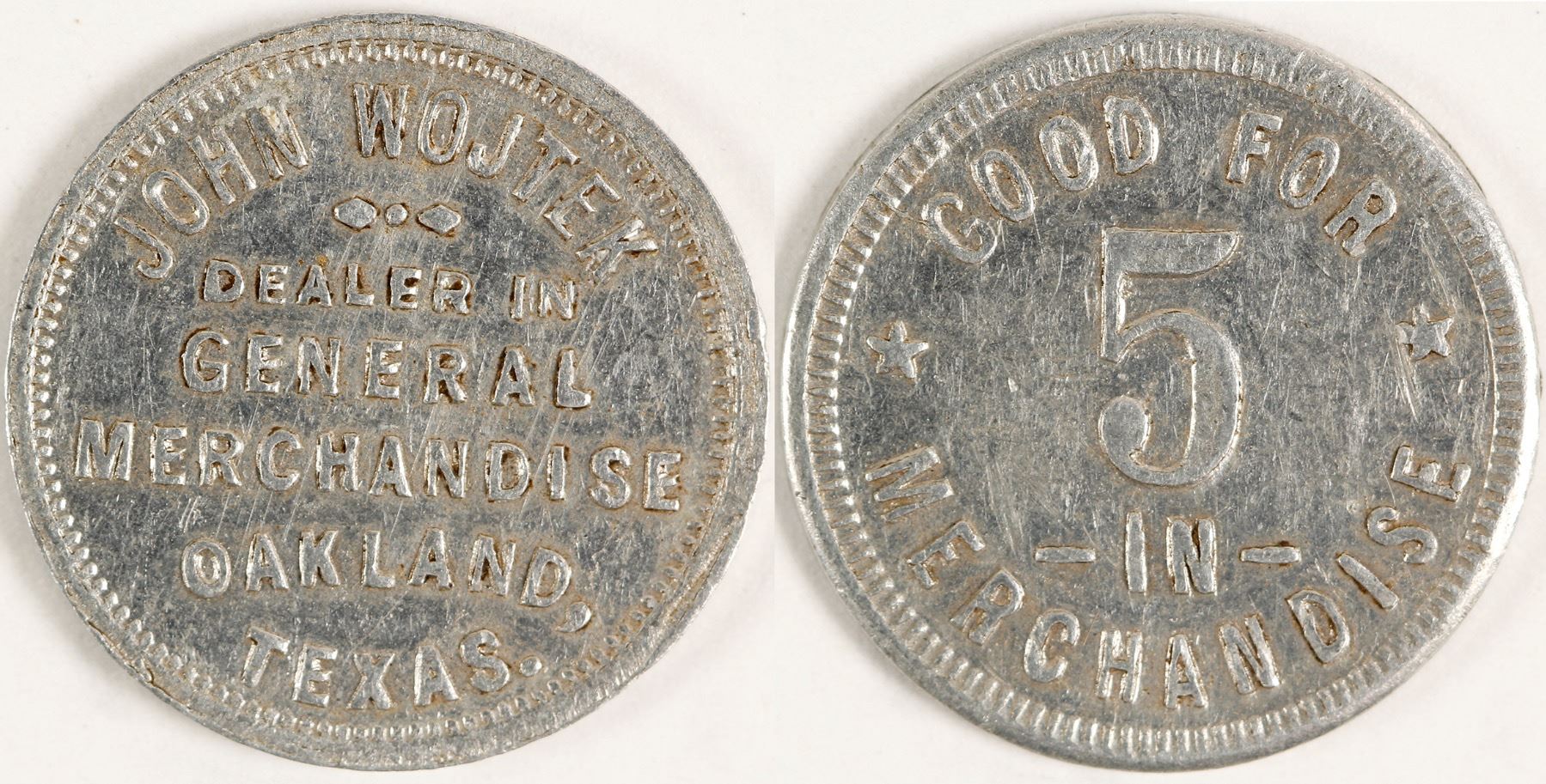 GF 5 IM token from farming town on Navidad river. Date: Location: Oakland, Texas HWAC# 62549