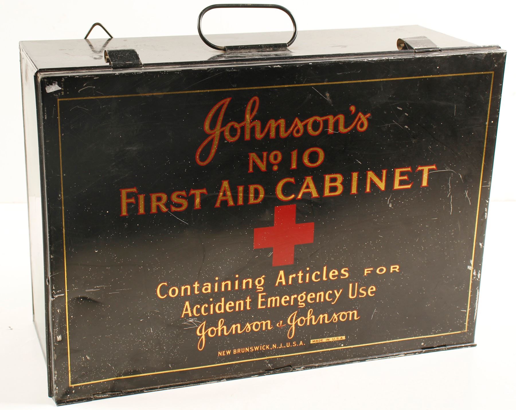 Johnson's First Aid Kit #10 in black tin box. Contents excellent, c 1900-1920 7 x 12 x 16". Pollock Collection. State: City: Date: HWAC# 84855