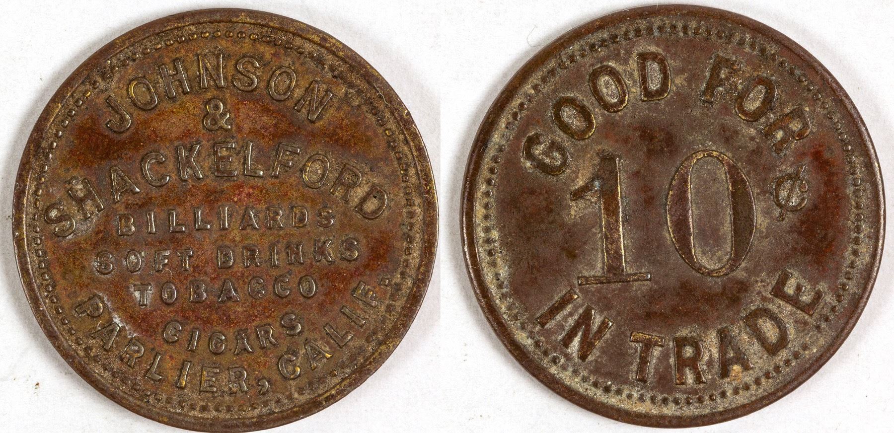 Obv.: Johnson / & / Shackelford / Billiards / Soft Drinks / Tobacco / Cigars / Parlier, Calif.; Rev.: Good For / 10c / In Trade. Rd., br., 24 mm. Rare token Fresno county. Daniel Manasselian Collection. State: California City: Parlier Date: ID# 76865