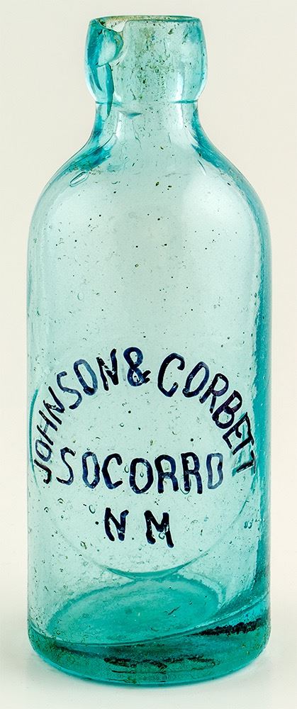 Johnson and Corbett, Socorro, New Mexico hutch. Embossing in circular slug plate. Blank base. 6 1/2 inches tall. Aqua. Told top, circa 1900 to 1910. Large lip chip. Rare. City: Socorro State: New Mexico Inventory Number: 38911