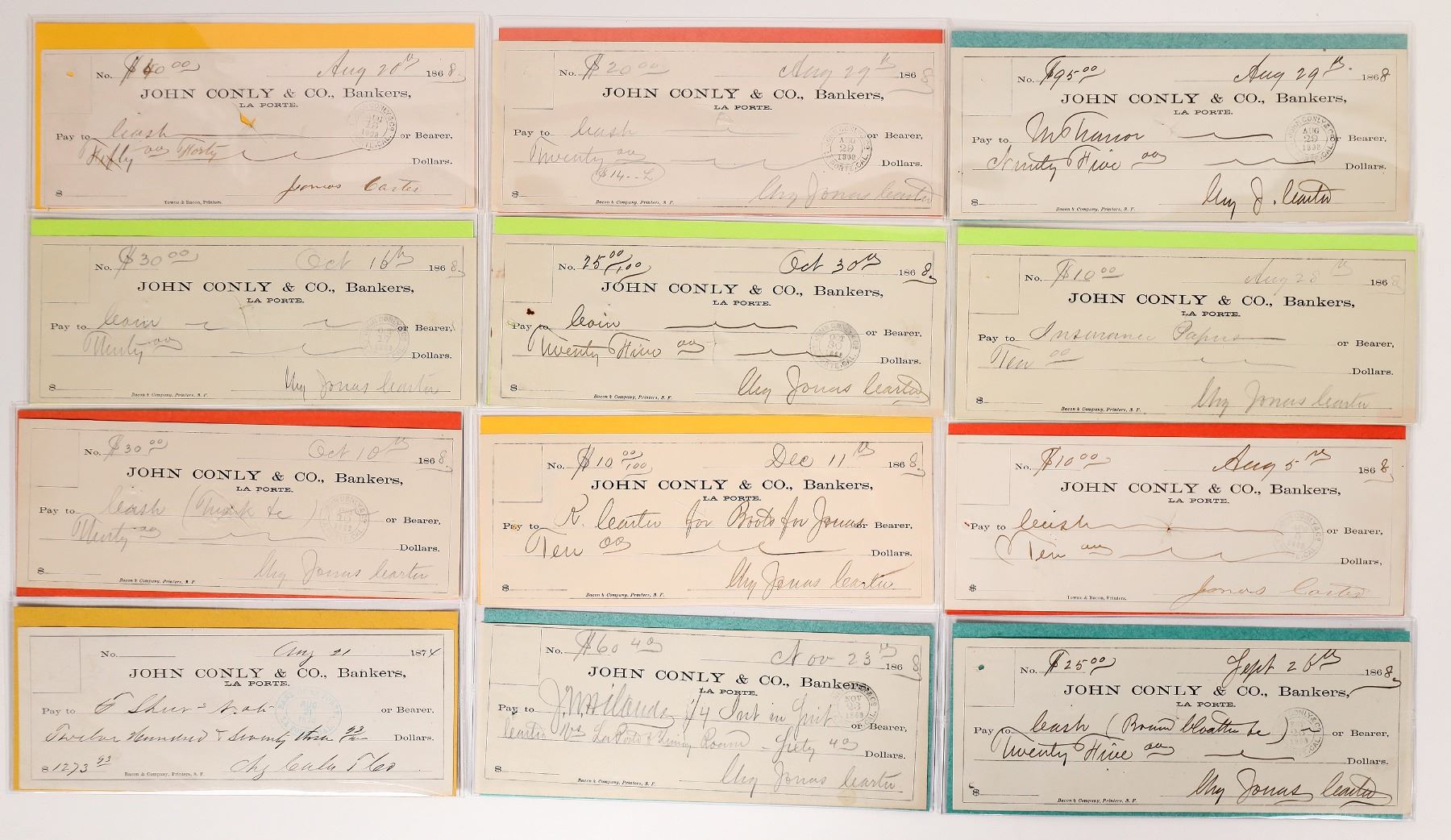 12 c. 1864-74 John Conley Banker checks from a private account of Jonas Carter, a surveyor in La Porte. No revenue stamps. La Porte California