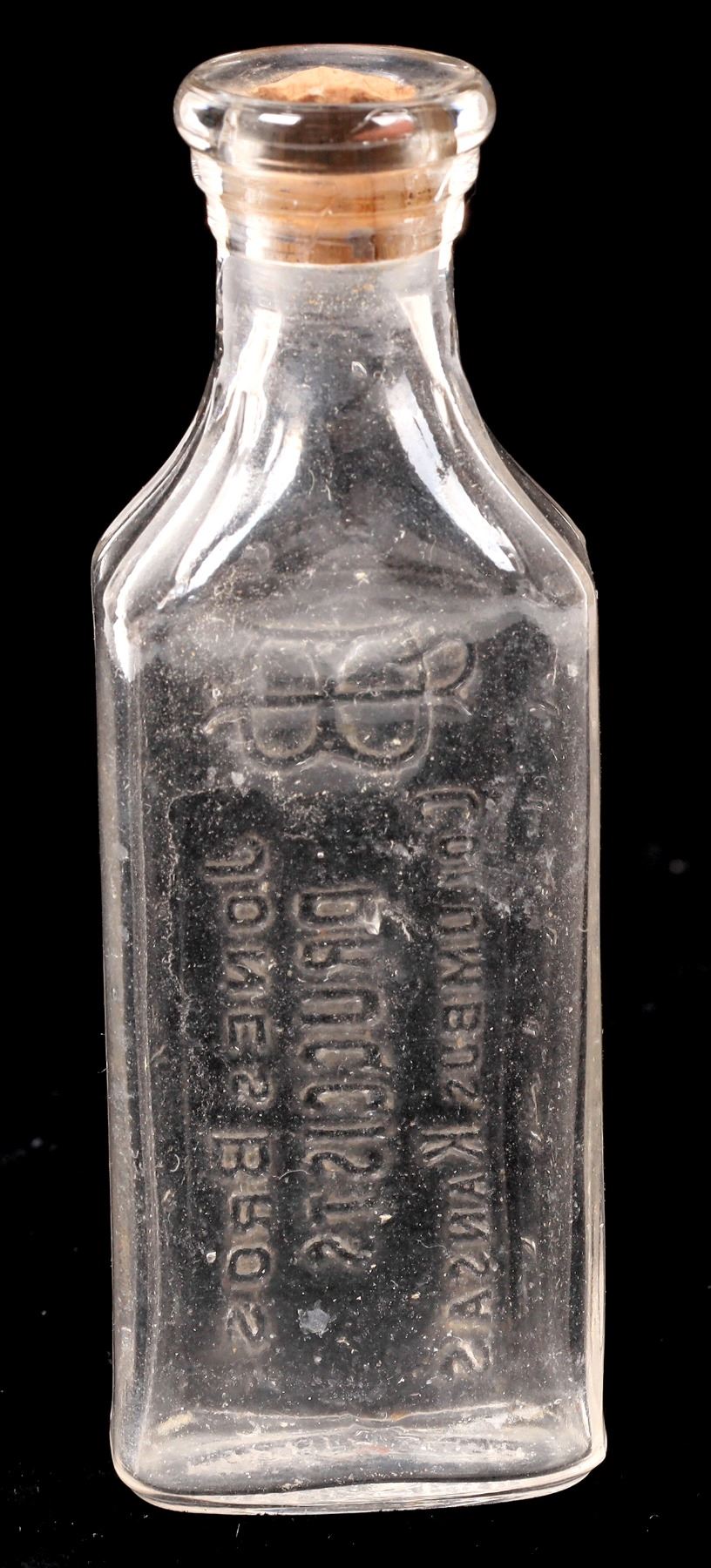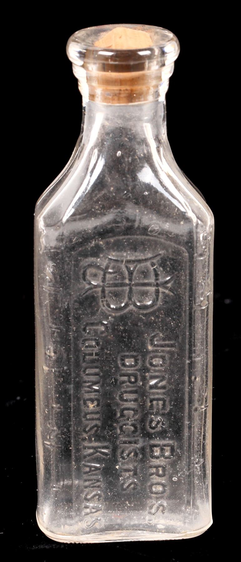 Embossed Jones Bros. Druggists medicine bottle. 3.75". No apparent chips or cracks. Kansas Columbus Gary Bracken Collection
