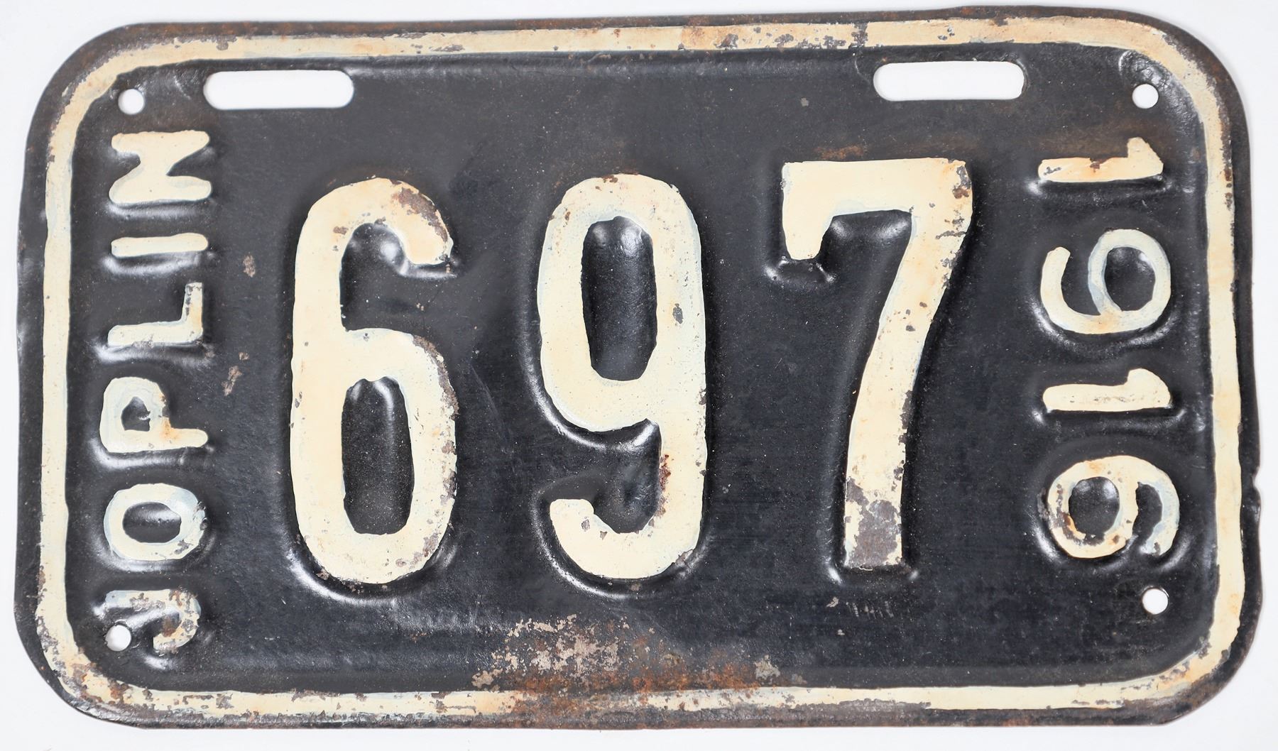 Rare 1916 motorcycle license plate from Joplin, Missouri. This is license plate number 697. White lettering on black background. 6 x 3.5 inches. Good condition, some wear and rust.