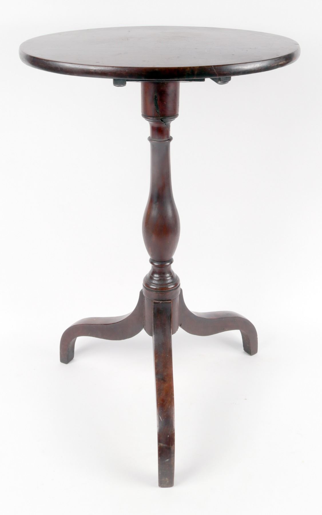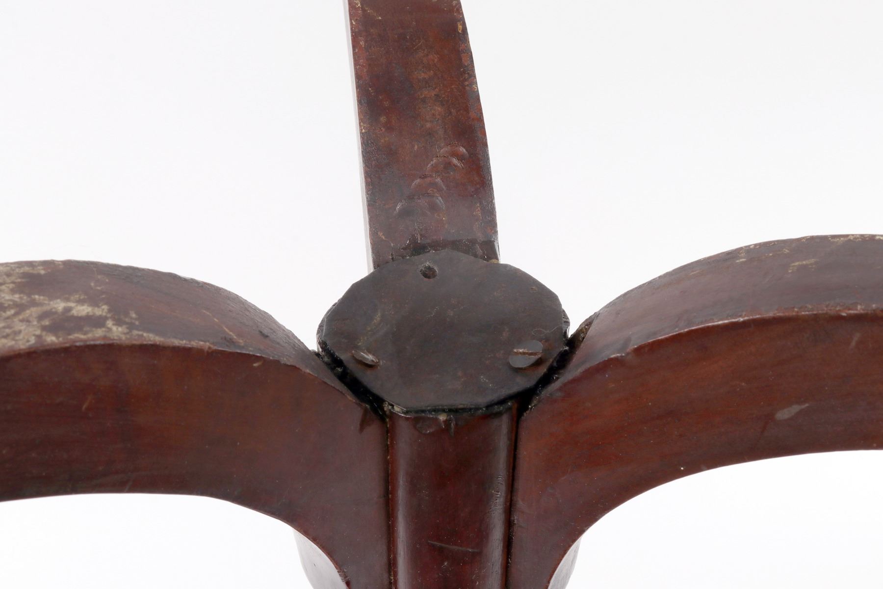 Mahogany 3 leg candle table that belonged to Joseph Bonaparte, and his been in the Hyatt family's possession since 1870. According to old note taped to the bottom of the table, "This candle table belonged to Joseph Bonaparte of Bordentown, NJ, who gave it to one of his retinue,(I think by the name of Boulanger) whose daughter Anna Dudley, gave it, with some "cornstalk" chairs, in our possession, to Dr. Pulaski F. Hyatt, father of John J. Hyatt who was a physician living in Bordentown." Signed by Laura K. Hyatt. Joseph Bonaparte was the brother of Napoleon Bonaparte and the exiled King of Spain. After the Battle of Waterloo, Joseph hired a vessel and with a large entourage, fled to America, and settled in Bordentown, NJ. In 1832 he went to England and distributed his furniture to those of his entourage who remained in America. This table was given to M. Belanges, whose daughter Martha gave it in later years to her physician and neighbor, Dr. Pulaski Hyatt. Round top 18" wide, height 27.75". Wood underside cross members have 6 non original screws, round metal plate on bottom of spindle has perhaps 1 original screw, 1 non original screw, and 1 missing screw. From the Hyatt Estate.