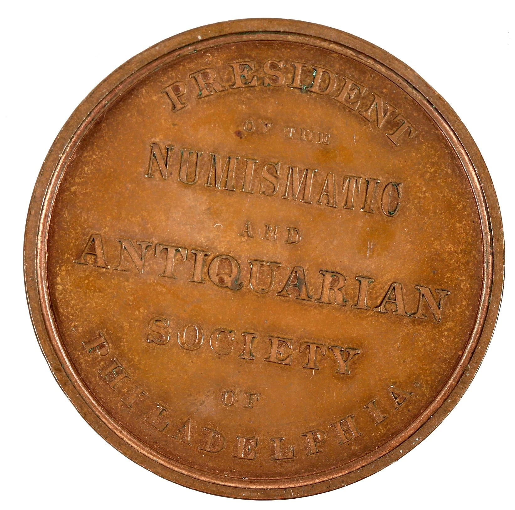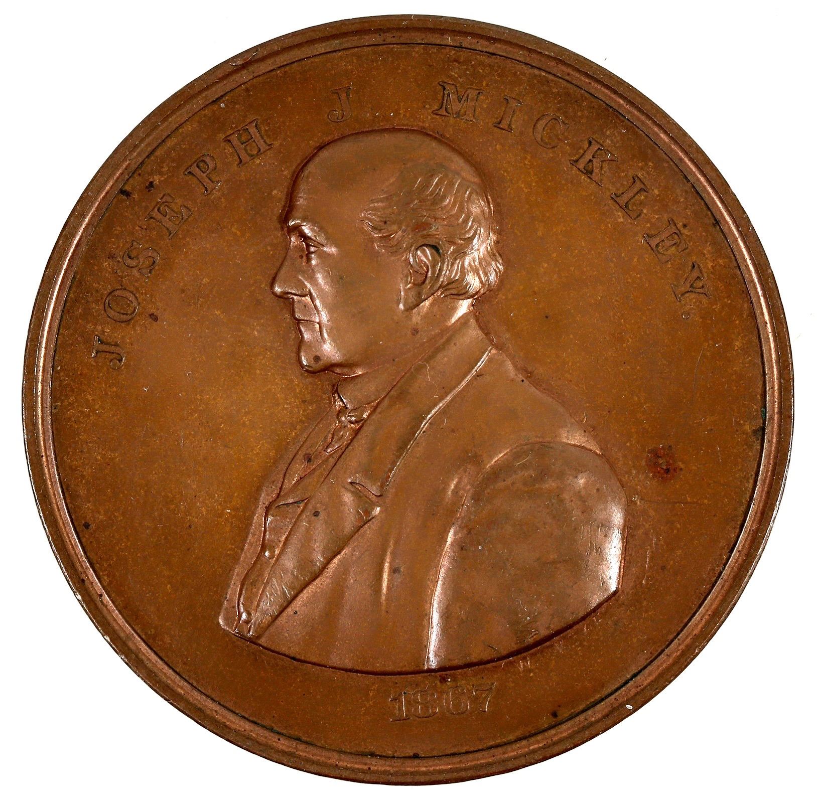 1867 Joseph J. Mickley Medal. By William H. Key. Bronze. About uncirculated, 50 mm. Obv: Bust of Mickley left, name JOSEPH J. MICKLEY above, date 1867 below, signed W. KEY F. at the base. Rev: Inscription PRESIDENT / OF THE / NUMISMATIC / AND / ANTIQUARIAN / SOCIETY / OF / PHILADELPHIA. Over the years, Mickley became a regular visitor at the U.S. Mint in Philadelphia, becoming close friends with mint curator William E. Dubois, who dubbed him the "Father of American Numismatics."
