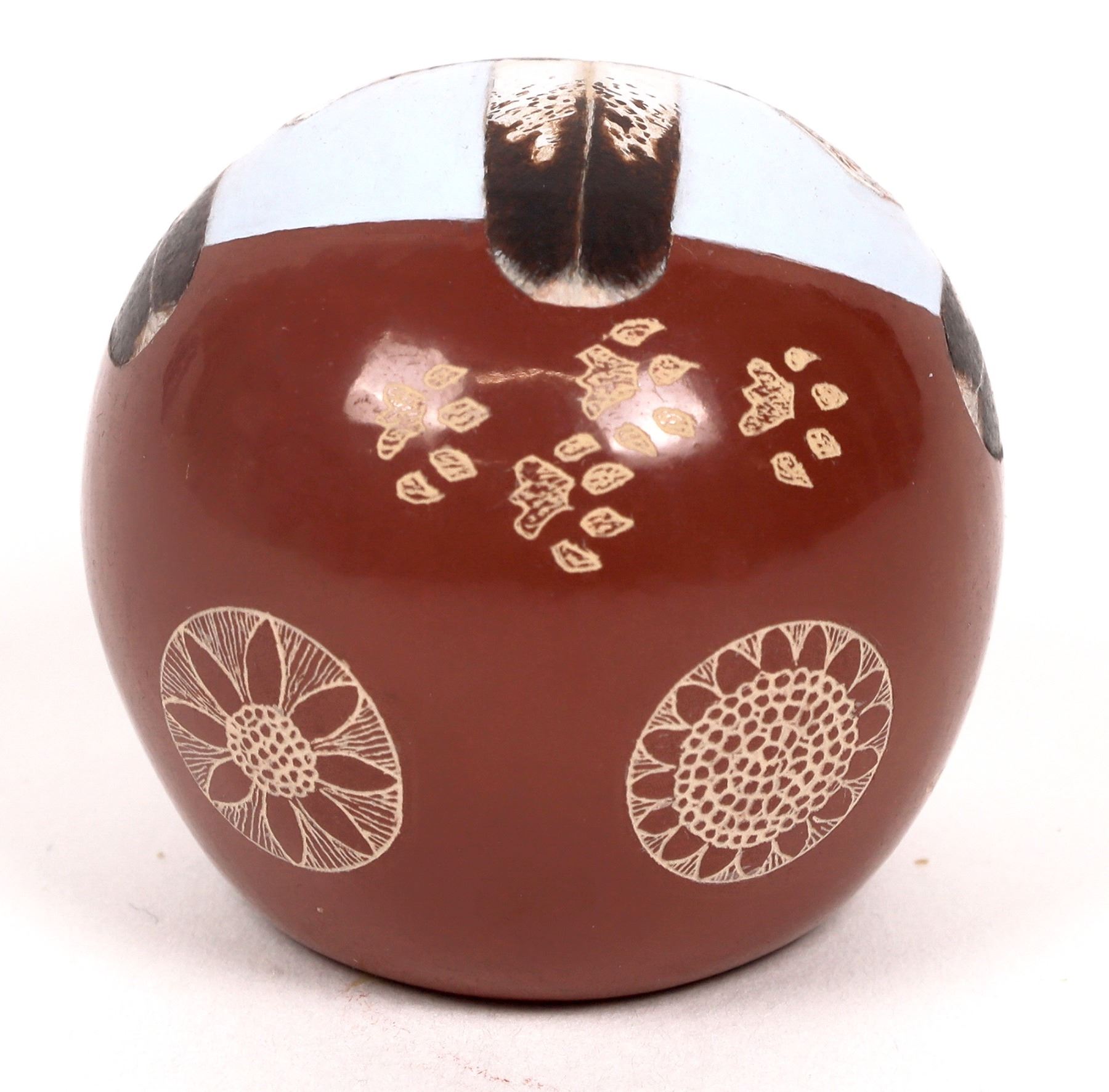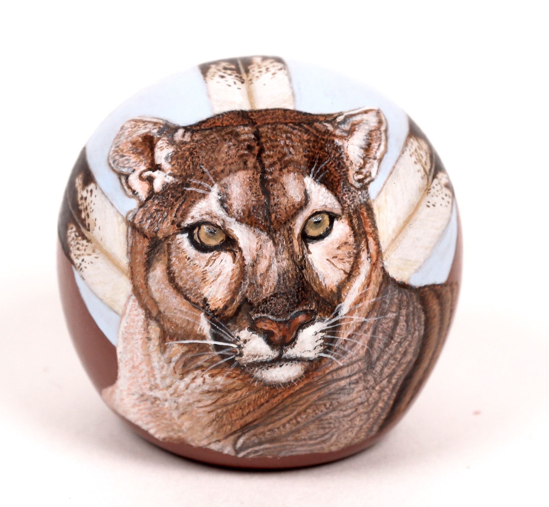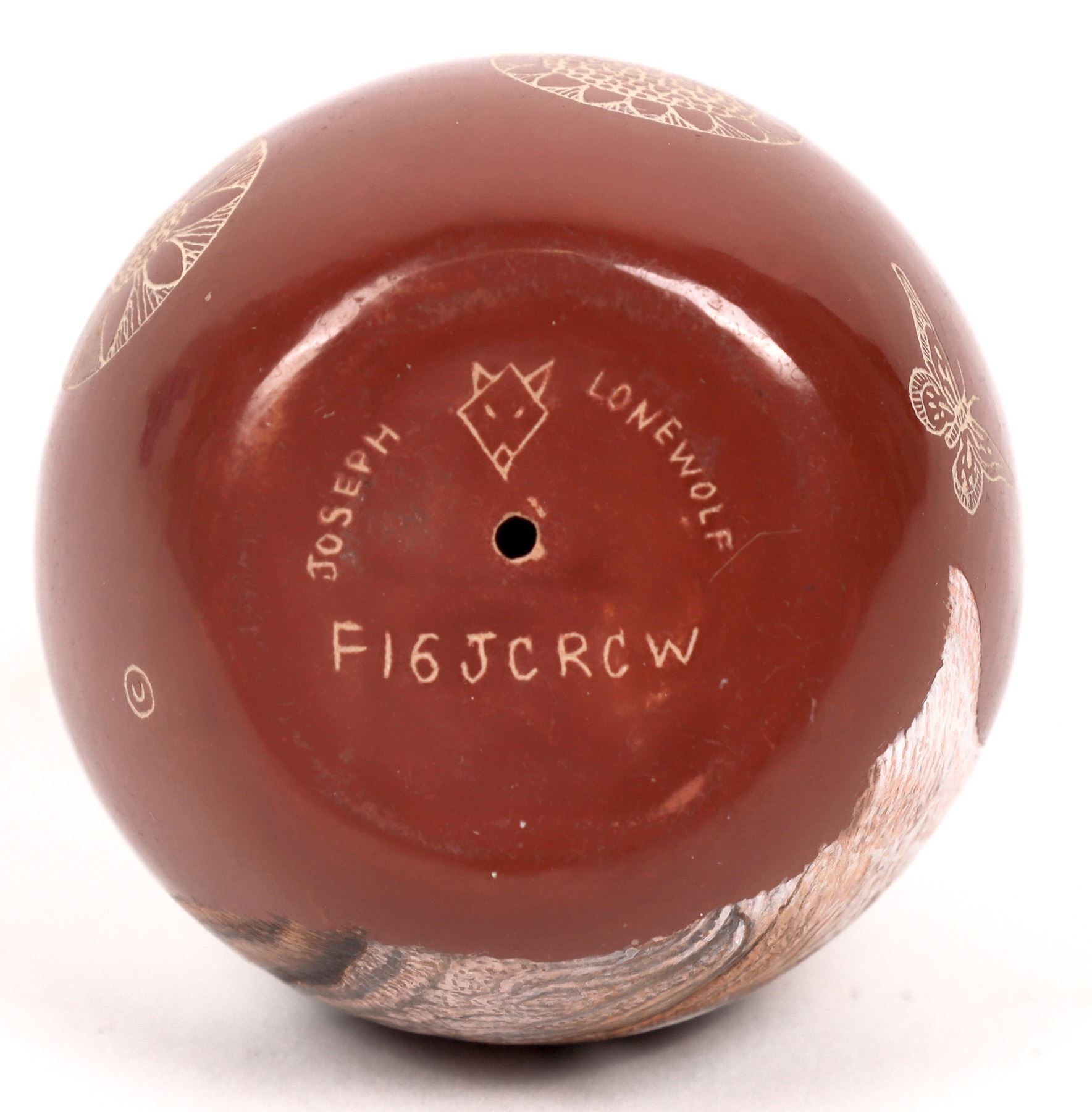 Incised pottery "jewel", intricate cougar design by Joseph Lonewolf (Santa Clara). Lonewolf (1932 - 2014) was a Native American potter from Santa Clara. He was known for his use of historical methods and his development of sgraffito and bas-relief techniques used a nail filed to a point as his main carving tool. His works, have often been referred to as "pottery jewels", and are notable for the use of Mimbres designs on sienna miniatures. "Each pot had a meaning but most are about nature". 1-3/8" diameter.