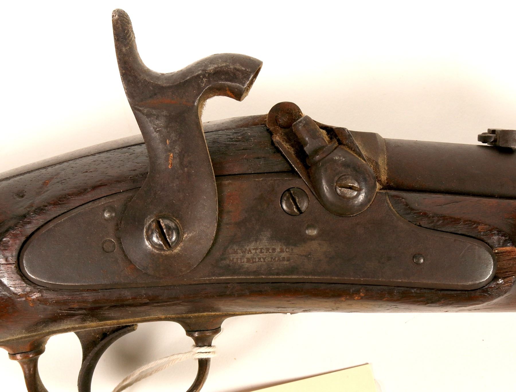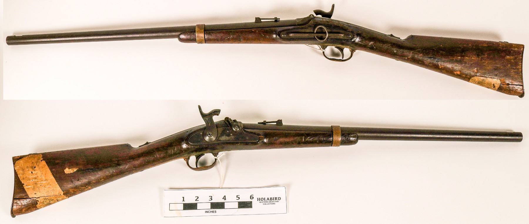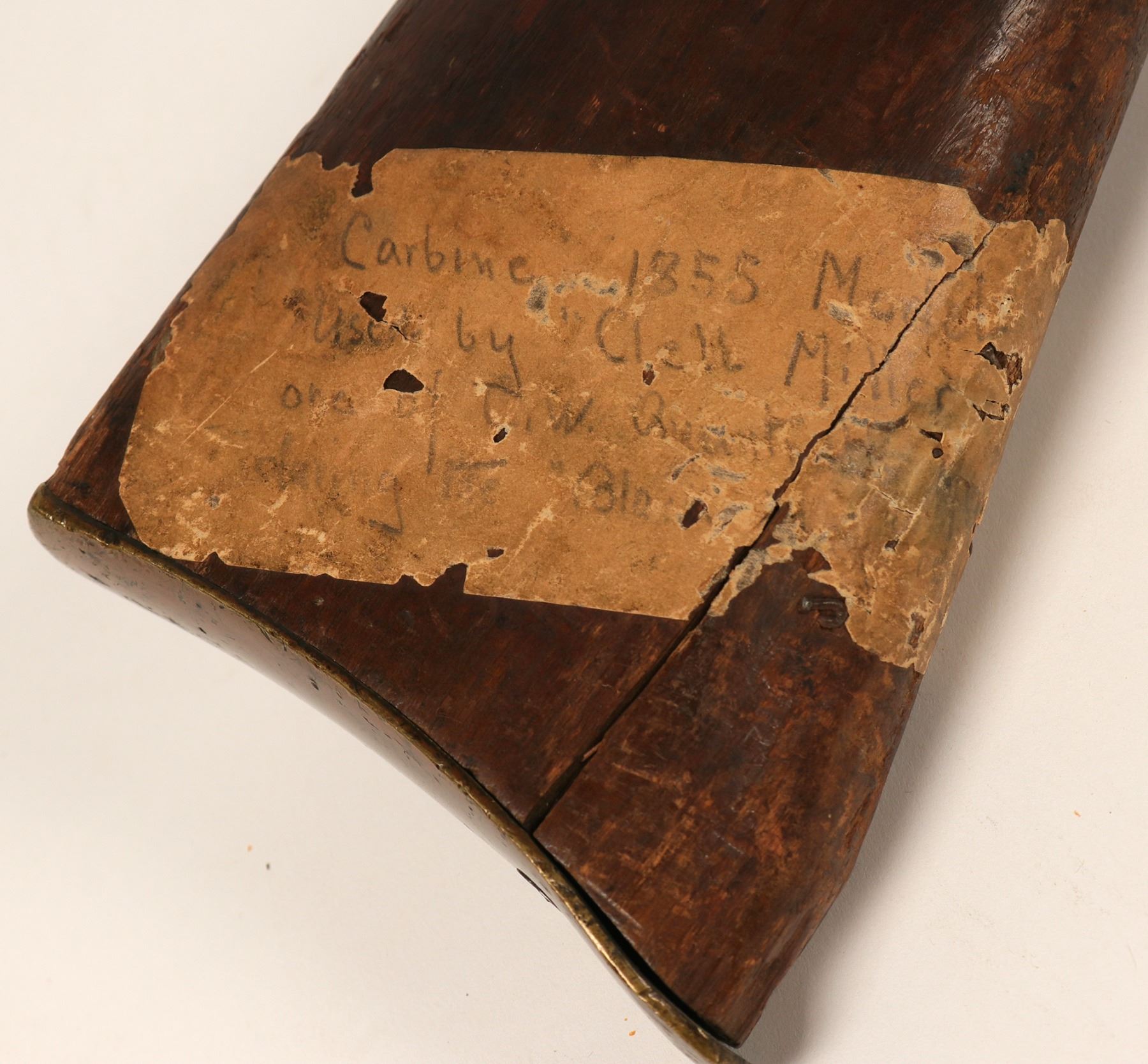 This is the model 1855 Joslyn carbine known as the "monkey tail" carbine. The condition of this gun is fair with the ring on the receiver missing as well as the front sight. The receiver lever can not be opened. The model 1855 is rarely seen today, and this gun wears 160 years of handling marks. There is a paper tag on the right side of the stock that reads: "Carbine 1855 model (illegible) used by Clell Miller one of Capt. W. Quantrill (illegible) of (illegible) during (illegible)". McClelland "Clell" Miller rode with Quantrill's Raiders at the age of 14 years. He was wounded on October 26, 1864 the same day as his leader "Bloody Bill" Anderson and 10 others were killed. Clell would be killed later on September 7, 1876 while robbing the Northfield Bank, in Minnesota with the James gang. (reference: penningtons.tripod.com/roster). The provenance of this gun cannot be confirmed. No attempt has been made to fire this firearm to confirm its mechanical integrity. Nor should this gun be fired with the examination by a qualified gunsmith. Any attempt to fire an antique is at the risk of the owner and not consistent with the value of the firearm. No sales to New York City, New Jersey, California, and Hawaii. Additional handling and shipping fees may apply. Please see photos for details.