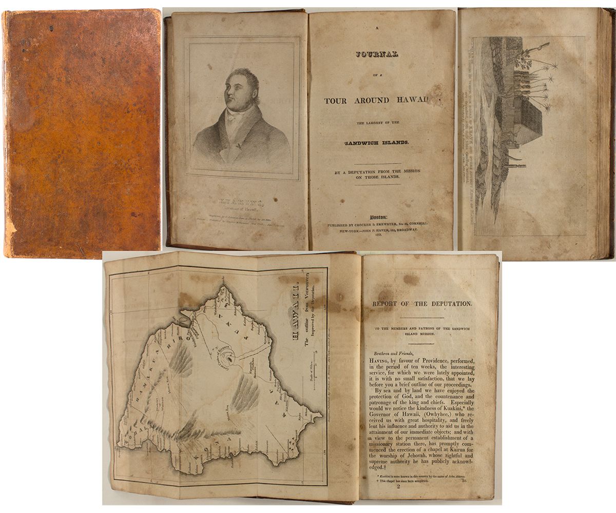 Published by Crocker & Brewster, New York. Includes directions to the binder on where to put illustrations. Includes map (stained, but in good shape-see online photo). Trip was taken in 1823. Includes descriptions of natural history, culture, and surf riding among other things. Cover rubbed and worn. Age toning (see online photo.)City: County: State: HIDate: