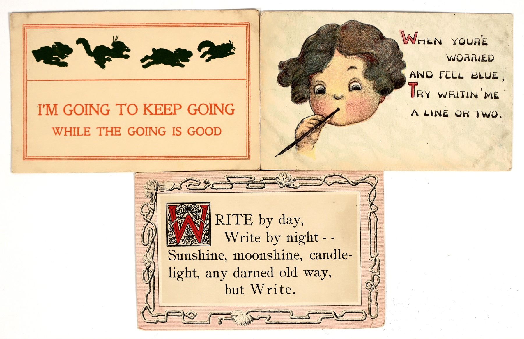 This is a lot of 3 postcards with encouraging messages and adorable designs on the front. The postcards were sent to different Montana cities, such as Sand Creek and Butte. Postcards are in good condition with no tears or major stains.