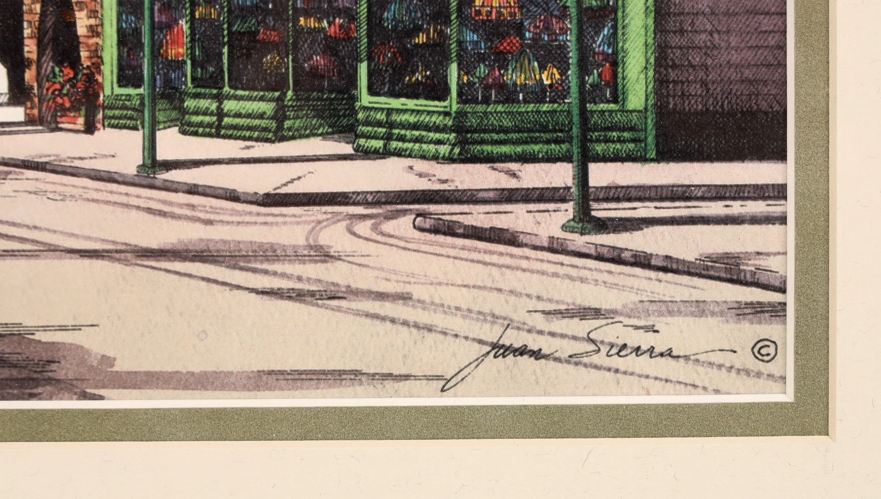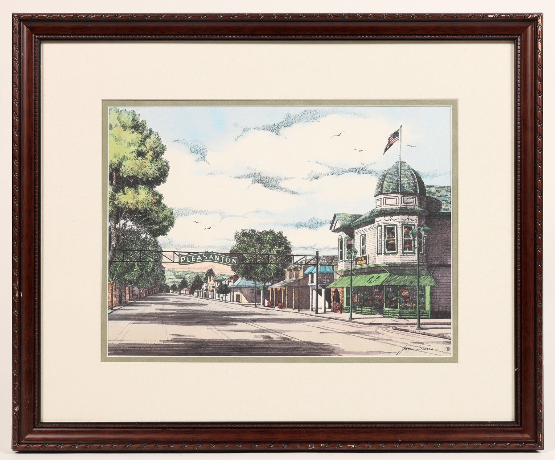 A 17"x 20" matted and framed print by artist Juan Sierra of the main street in Pleasanton, California. Sierra is a California native and has painted many of the Victorian and Queen Ann houses in the area. Frame is slightly nicked, but ready to hang. Please see photos for more details.[ Pleasanton California