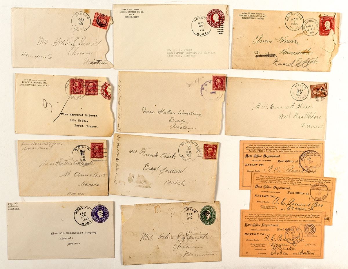 Lot of thirteen. 1) 1909 Benchland (1909-1964) with a letter written in Czechoslovakian. Mailed within three months of the opening of the post office. 2-3) Two 1896 Barker's (1892-1903). 4) 1888 Kibbey (1883-1909) double circle on postal card. Four reported in Shellen & Dunn. 5) 1882 Stanford (1882-date) on postal card. Very early. Six listed in Shellen & Dunn. 6) 1883 Utica (1881-1951). 7) 1885 blue double circle Philbrook (1881-1912). Six listed in Shellen & Dunn. Postal Card. Also very early Kolin (1914), 1906 Knerville (1898-1915), Hobsen, Hughesville, Dover. (Svoboda Collection) City: Judith Basin State: Montana Date: 1882-1933 HWAC# 27964