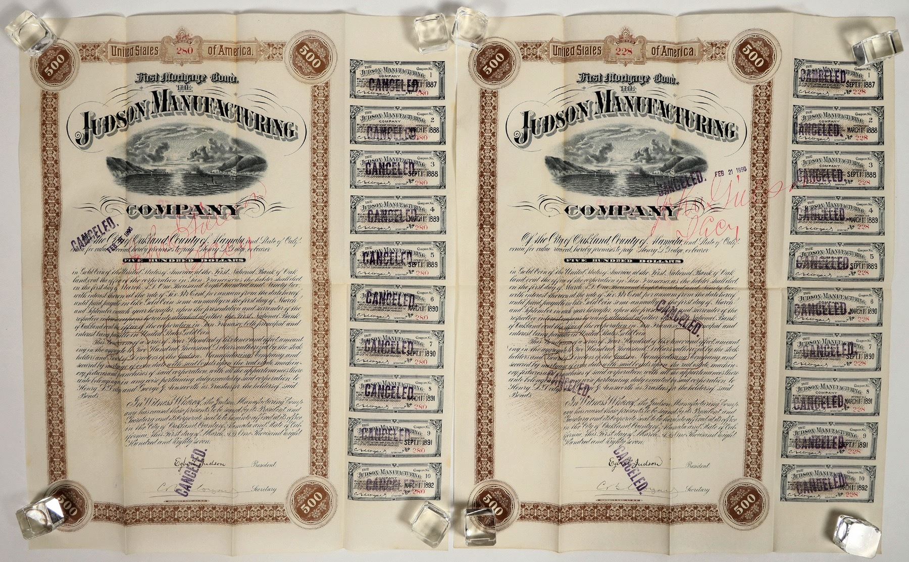 2x 1881 Judson Manufacturing bonds, signed by President Egbert Judson. Founded in 1882, they initially were an explosives company later expanding into structured steel and other building products. They were the main contractor for the superstructure on the Richmond-San Rafael Bridge. Fine condition with all coupons.