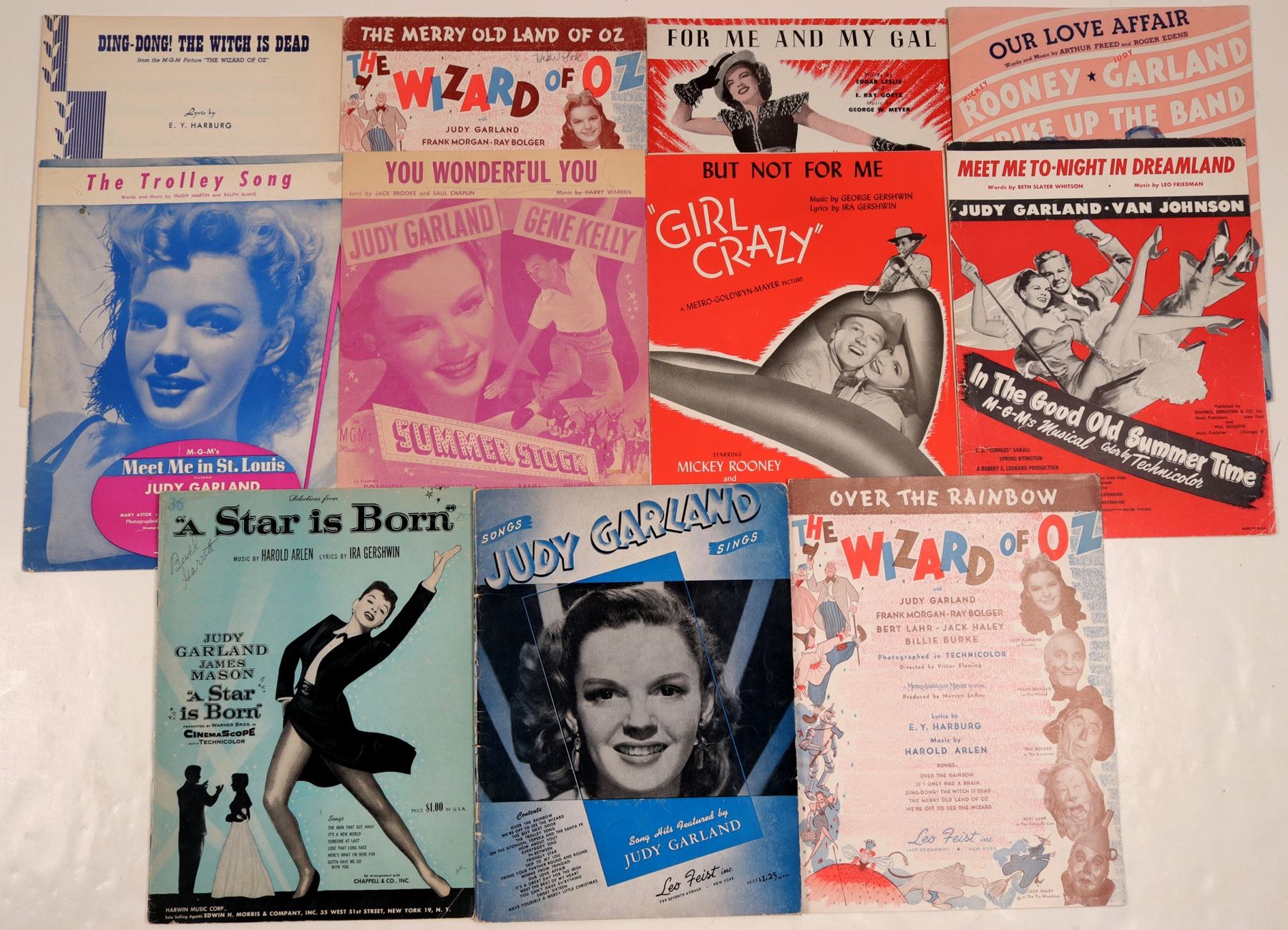 Eleven pieces of sheet music from one of America's best loved actresses, Judy Garland. The Wizard of Oz is represented by "Ding Dong the Witch is Dead," "The Merry Old Land of Oz," and, of course, "Over the Rainbow." Others include the 1954 version of "A Star is Born," "For Me and My Gal," "Strike up the Band," selections from "Meet Me in St. Louis," "Summer Stock," "Girl Crazy," ans "In the Good Old Summer Time." City: State: Date: