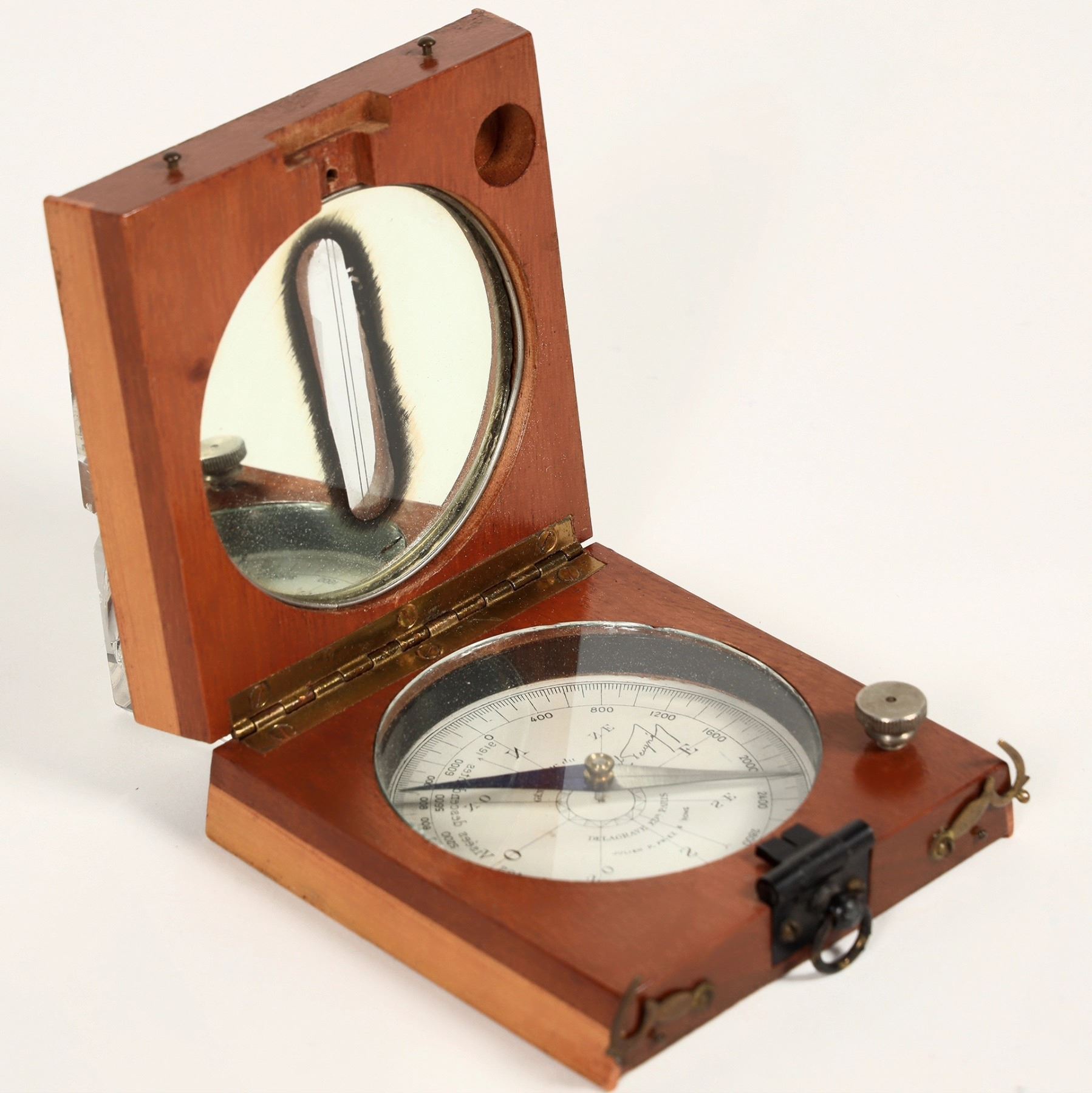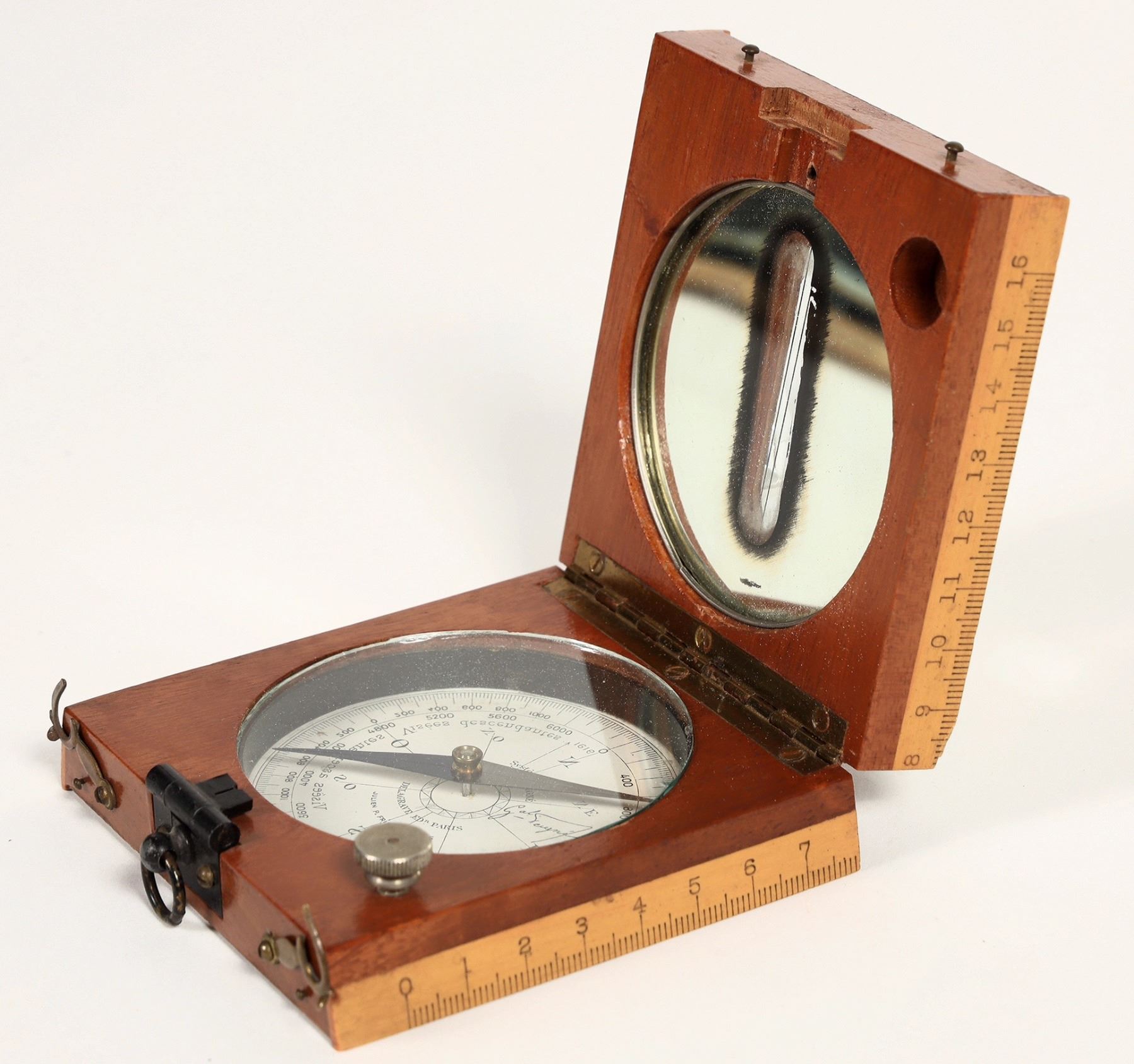 This wood box compass was made by Julien P. Friez about 1910. The box is of teak with light colored hardwood used with a scale on the vertical side. It is used to measure inclination distances. Likely used in WW1. The top of the box has instructions to calculate distance from the inclination. The needle stop does not work. However the needle still reads correctly. 3.5 in. X 3.5 in. Please see photo for details.