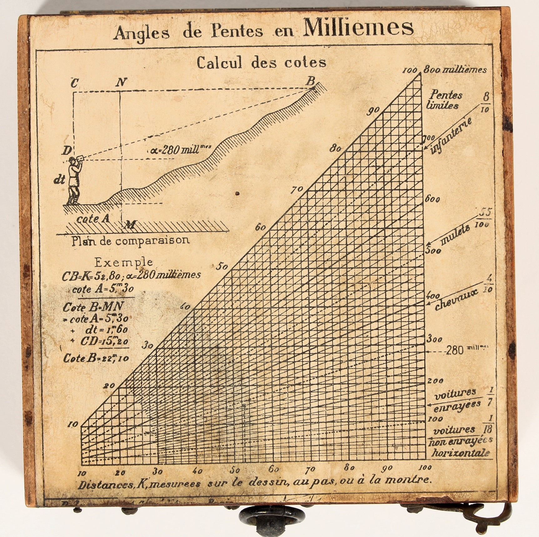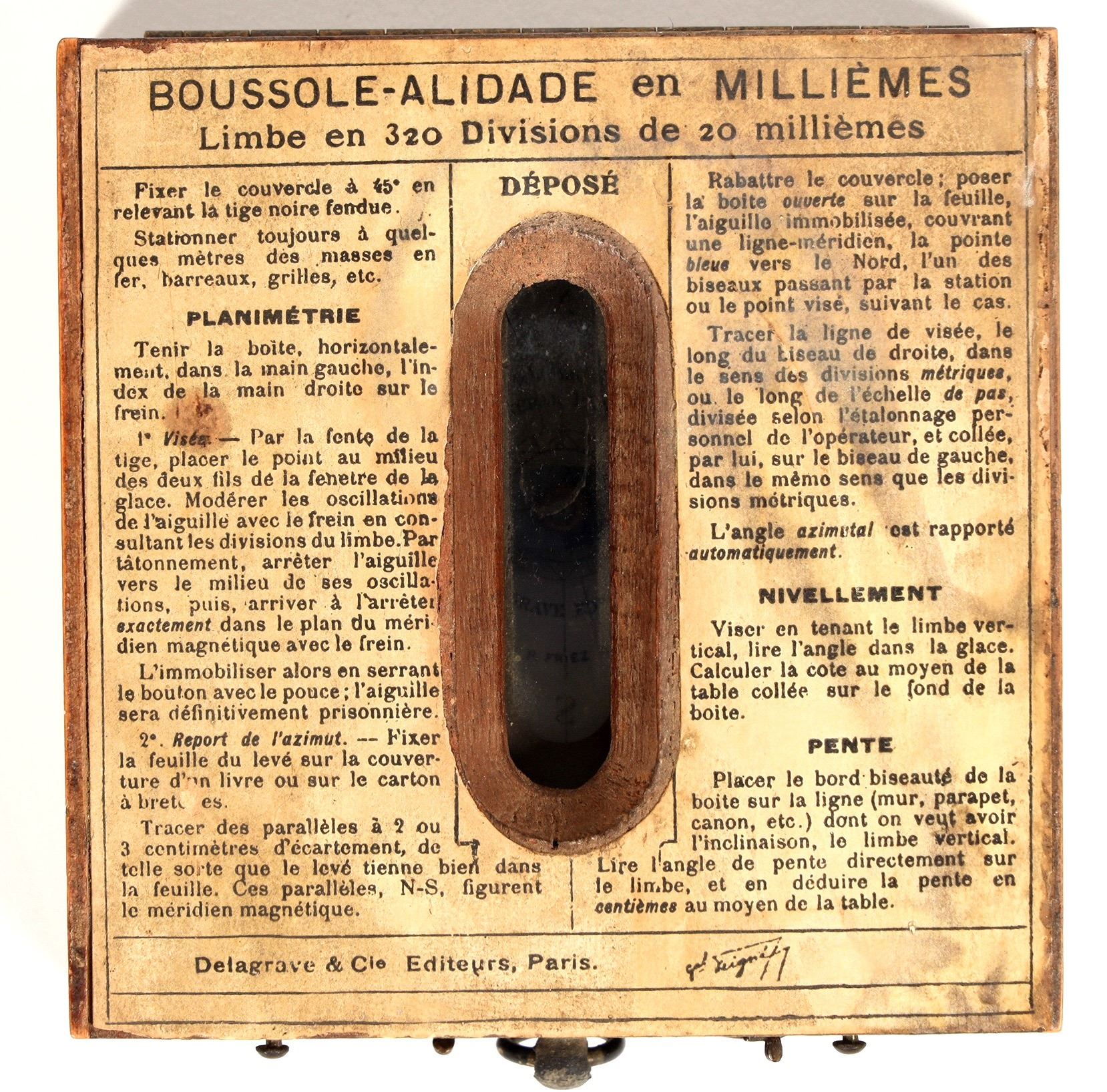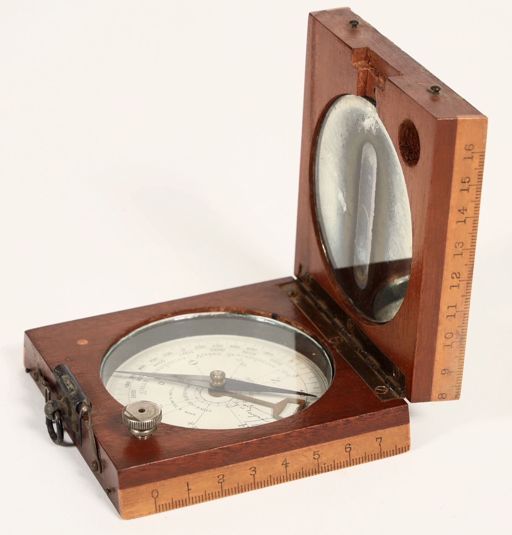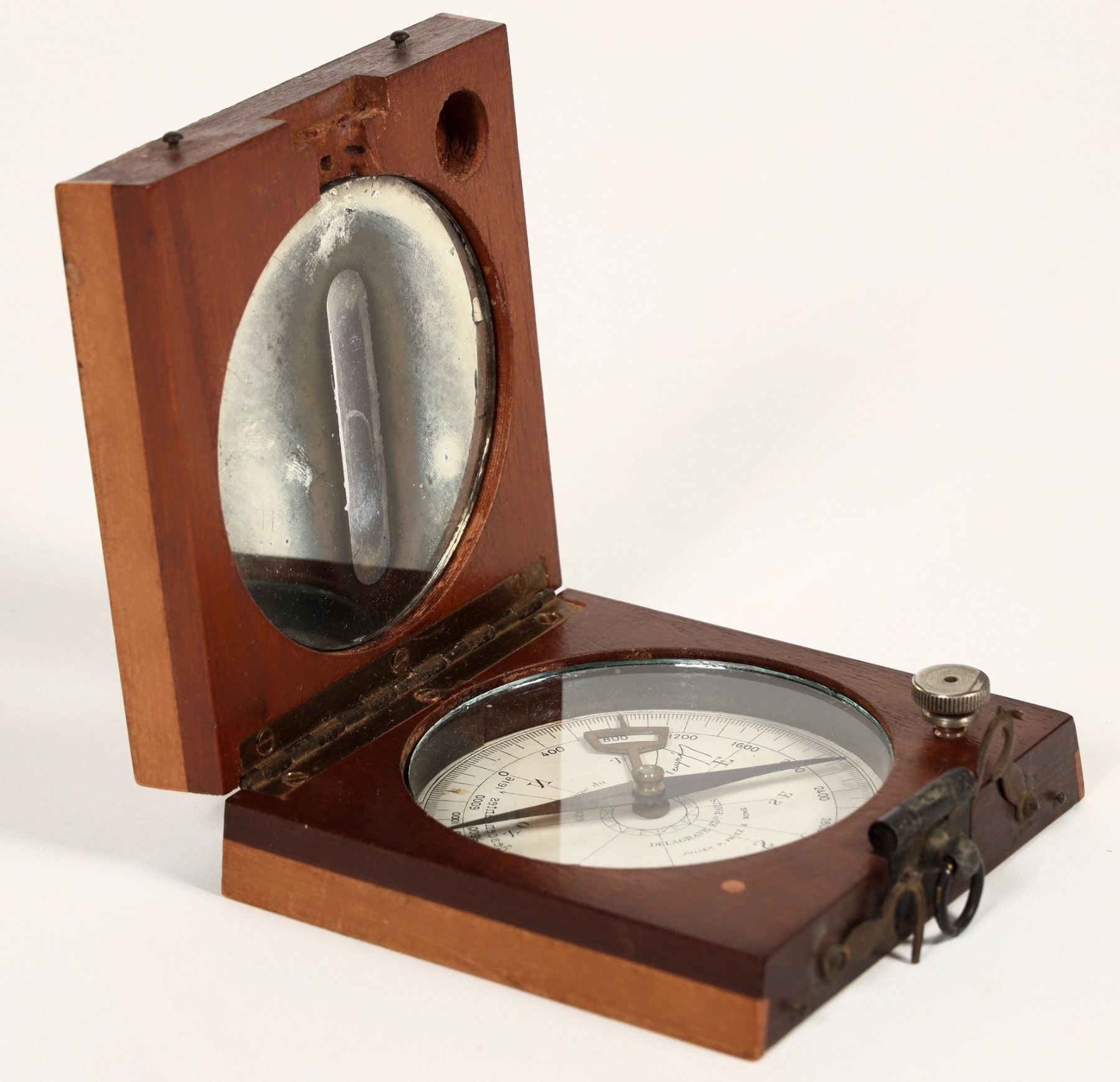 This wood box compass was made by Julien P. Friez about 1910. The box is of teak with light colored hardwood used with a scale on the vertical side. It is used to measure inclination distances. Likely used in WW1. The top of the box has instructions to calculate distance from the inclination. The paper has spotting. The lens cover glass is not secured and needs a spring ring to secure it and the rear sight is missing. The compass needle reads correctly. 3.5 in. X 3.5 in. Please see photo for details.