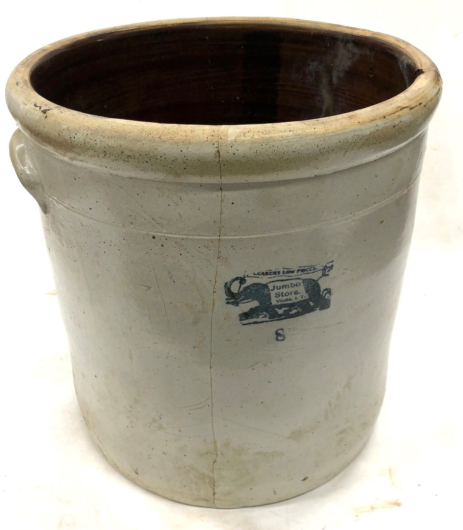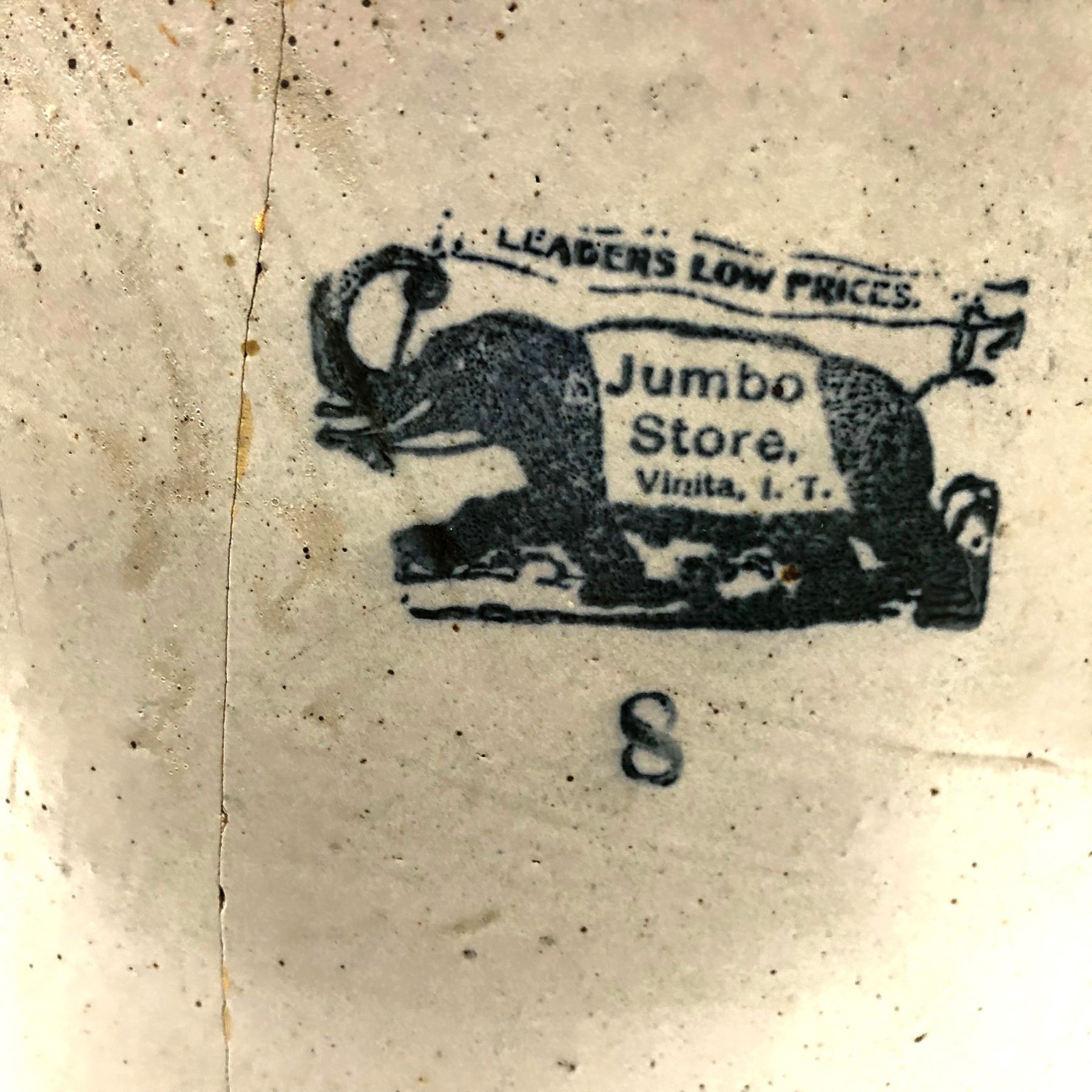 Jumbo Store, Vinita, Indian Territory #8 Pot, 15" tall. 14" diameter. Pictorial, name within a blue elephant. This is a repaired, broken approximately in half, pot. Displays just fine.