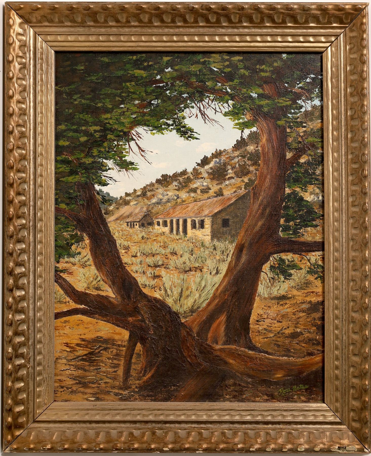 Original Nevada Artwork by Rose Bates, dated on reverse May 1970. Acrylic on Canvas panel, 16 x 20 with heavy wood frame. Jefferson is a ghost town in Lincoln County, Nevada. Artist signature bottom right and info handwritten on reverse.