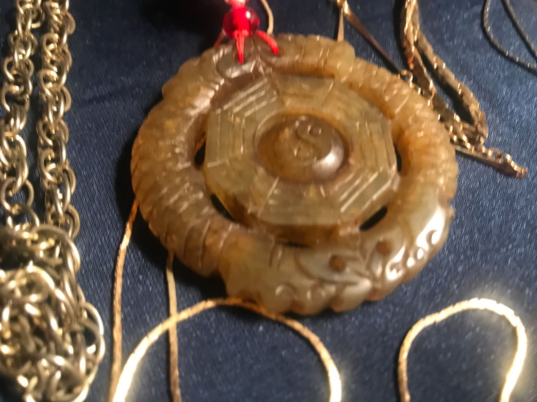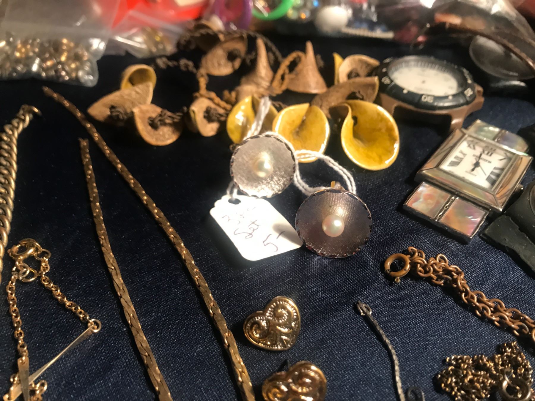 Broken chains, some silver, random pieces from the bottom of the box. Military buttons, watch bands, necklaces, beads, large bag of plastic fashion jewelry, earring backs, necklace clasps, earring hooks, leather cords, broken watches, cuff links, faux pearls, fake loose stones. Come and get it. Maybe some hidden treasures like perfect condition, like new faux diamond tennis bracelet, or the antique chinese pendant made of jade??