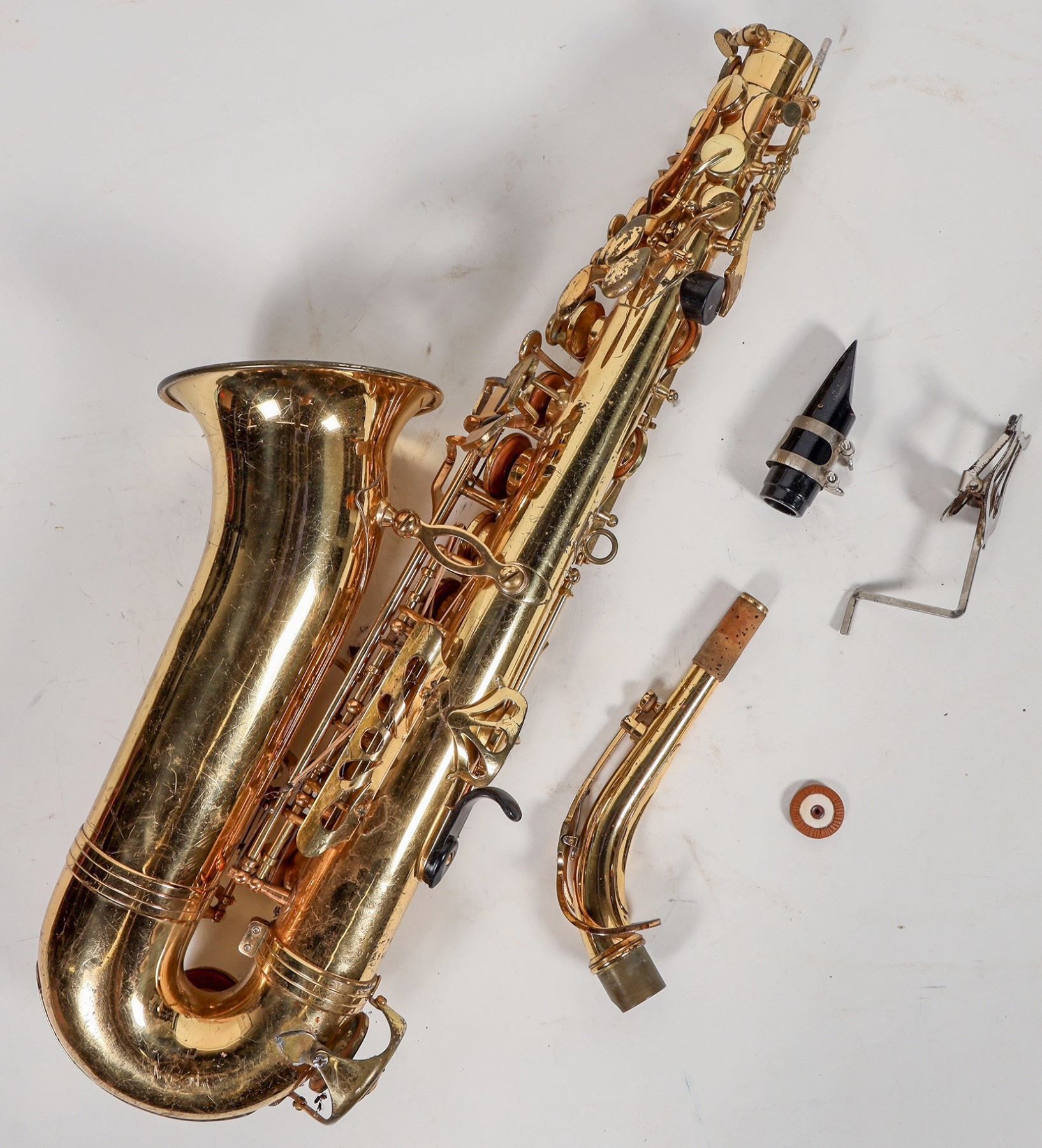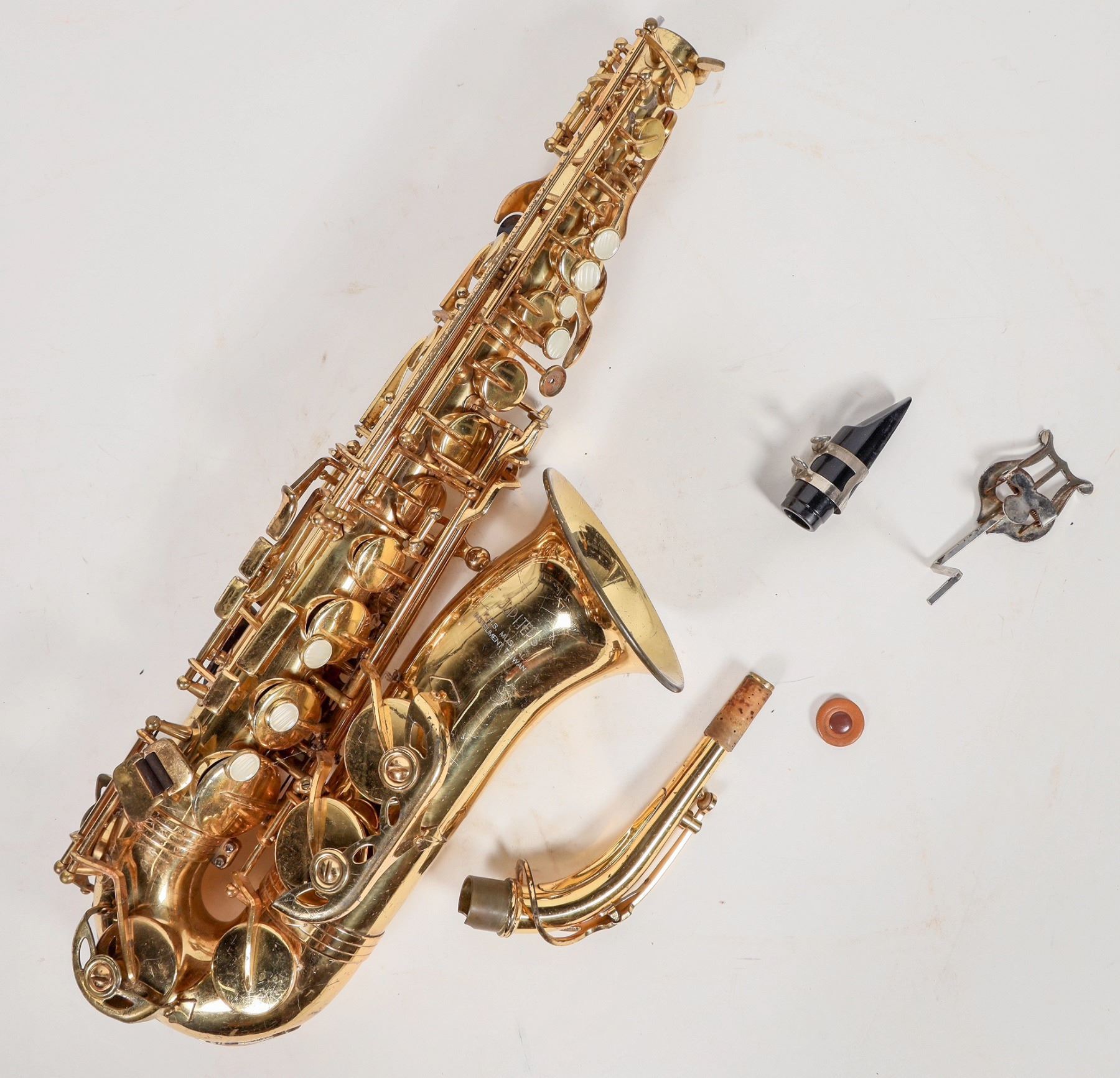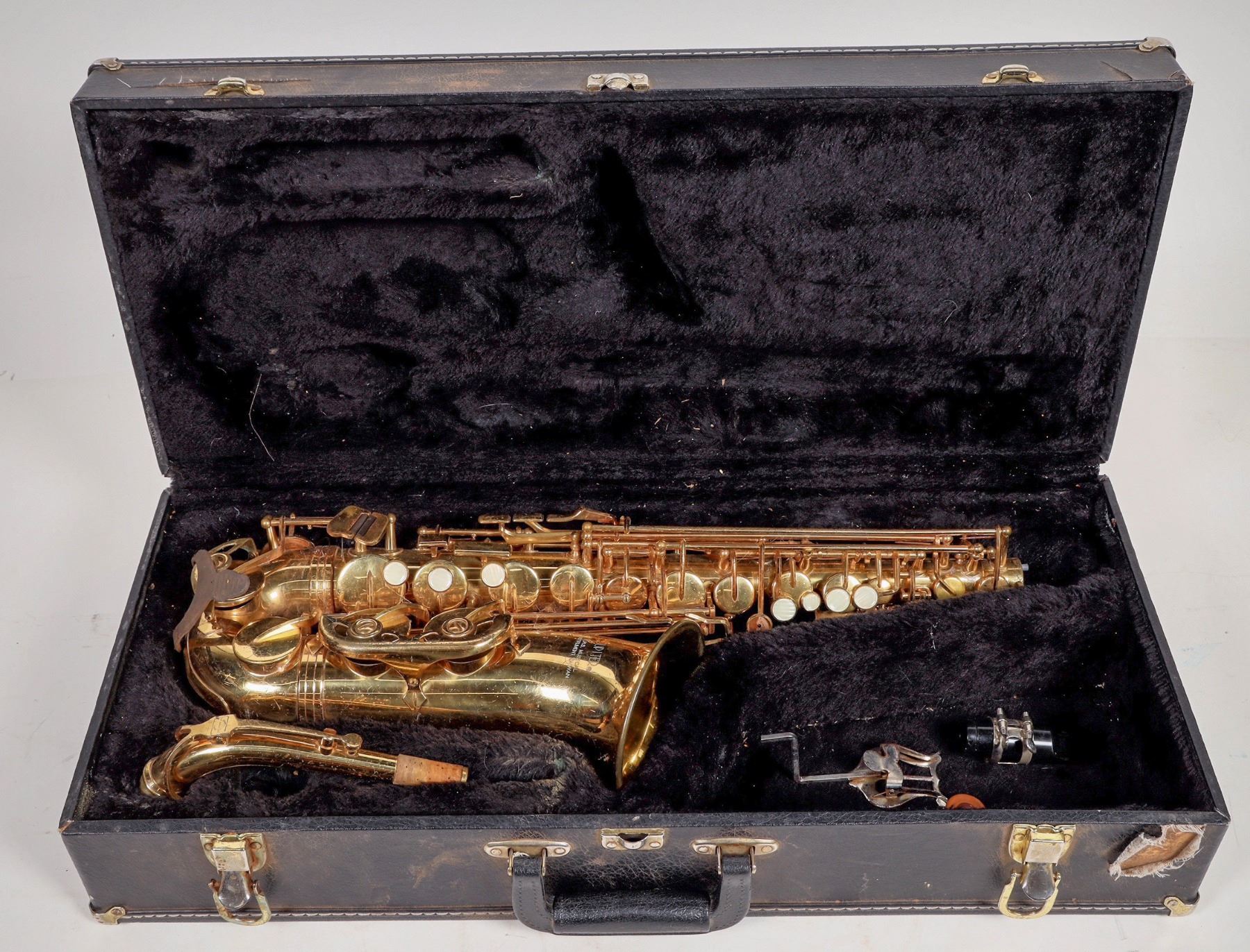 Jupiter KHS alto saxophone in case. Case has wear, instrument brass has scuffs, 1 key missing inlay. Not tested. Please inspect.