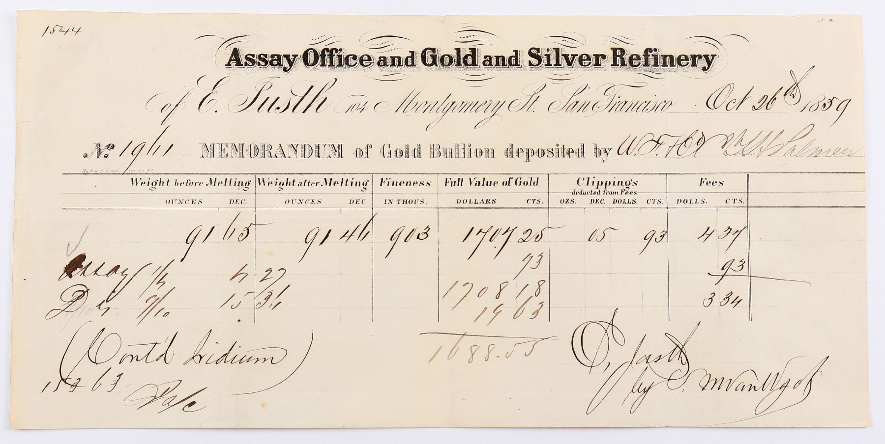 San Francisco, California Gold Rush Assay Office Receipt E. Justh refinery 1859 - Fancy printing on this receipt for gold bullion. ìAssay office and gold and Silver Refinery, of E. Justh 104 Montgomery St. San Francisco Oct. 26th, 1859. No.1906 Memorandum of Gold Bullion deposited by Wells Fargo & Co. for CTH Palmer. Weight before melting: 91.65 troy oz. After melting: 91.46. Fineness: .903. Full Value of Gold: $1,707.25. Signed for E. Justh by his employee Sidney Van Wyck an assayer who worked for a time before being employed by E. Justh, at the San Francisco Mint. Van Wyck later went on to become the sole assayer in the new mining camps of the post 1860 era of Aurora, Virginia City, Gold Hill, and Hamilton. These certificates are particularly collectible because of their direct relationship to the Justh & Hunter gold ingots found on the 1857 wreck of the Steamer, S.S. Central America. Very Fine condition. Low R6. Size: 10.5 x 5.25 inches. San Francisco California 1859