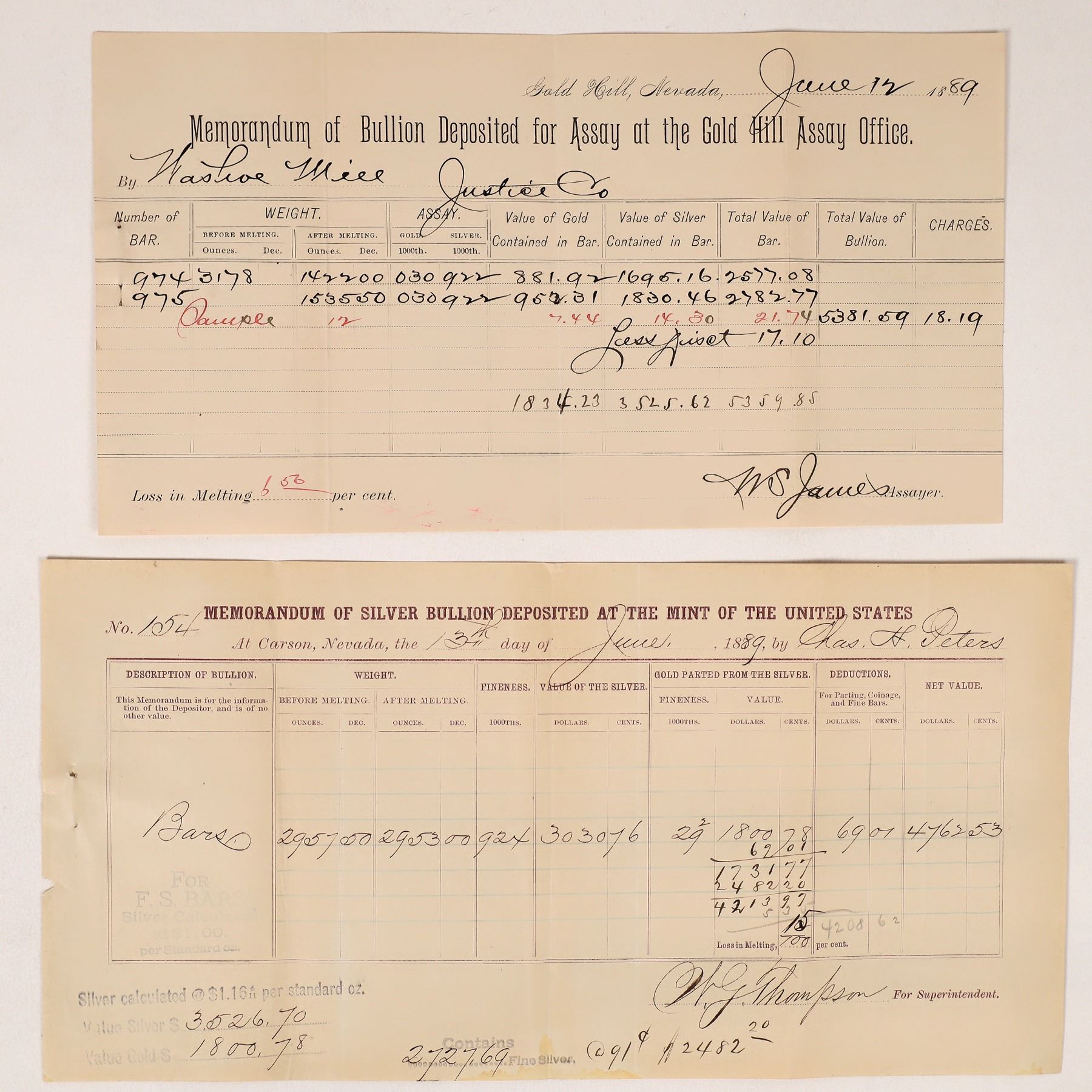 Two documents attached to each other. Top is a Memorandum of Bullion Deposited for Assay at the Gold Hill Assay Office on June 12, 1889 by the Washoe Mill for the Justice Co. Two bullion bars produced, 1,422 and 1,535 ounces, .922 fineness silver. Signed by assayer WS James. 5.25 x 9.5" Attached to a Carson City Mint Memorandum of Silver Bullion. Deposited by Chas. H. Peters for the mine (he was also an insurance agent in Carson). Signed by WG Thompson for Supt. Purple print. 5.5 x 11" The Justice Mine was staked in 1859. It was located near Devils Gate in Silver City. In the 1870s, a shaft was sunk to explore the Comstock Lode at great depth (similar shafts were sunk in Gold Hill and Virginia City). The Washoe Mill was also near Devils Gate and was also known as the Devils Gate Mill. In June 1889, the Carson City Mint was still not producing coins (it had been on hiatus since 1885). However, just 4 months later, they would begin striking coins again.