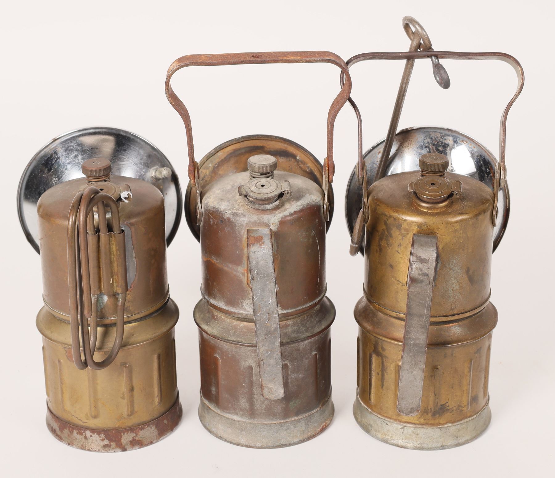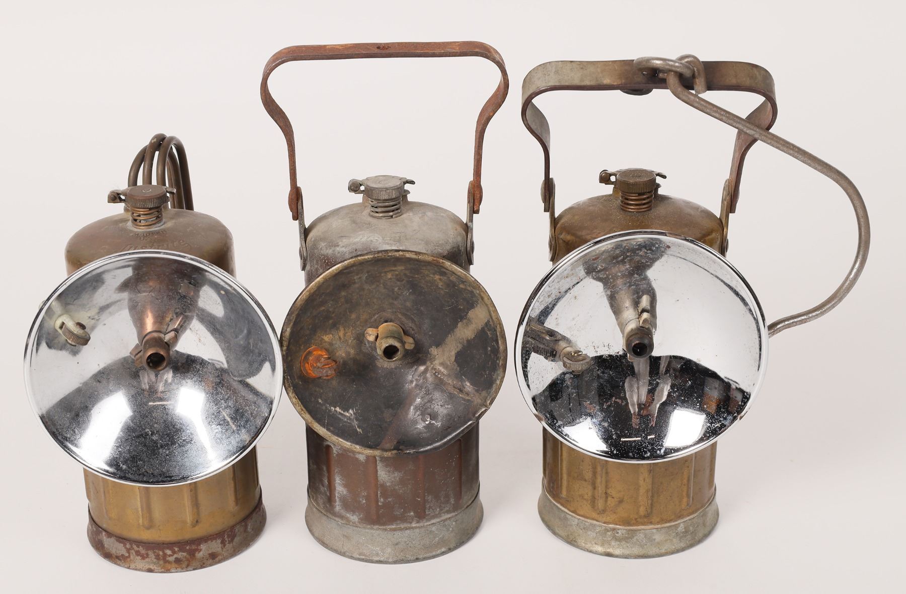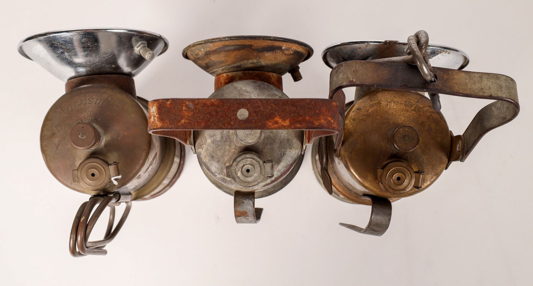 3 Justrite carbide hand lamps. 8 hour-1 with bail, 1 with hook and bail. 9 hour-with hook and handles.